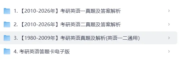 今天给大家整理好了考研英语一站式真题大礼包横跨 46 年真题,英一英二精准分类,配套完整解析 + 考场原版答题卡全部电子版无水印,夸克网盘直接保存,免费领取无套路!