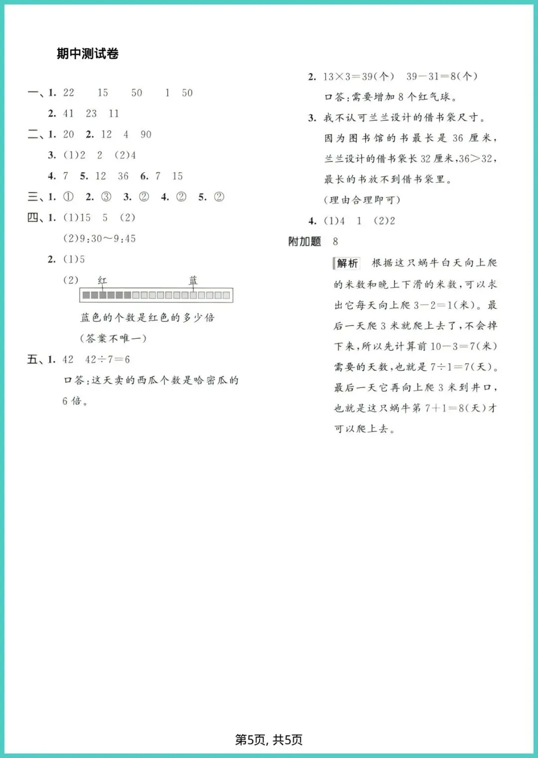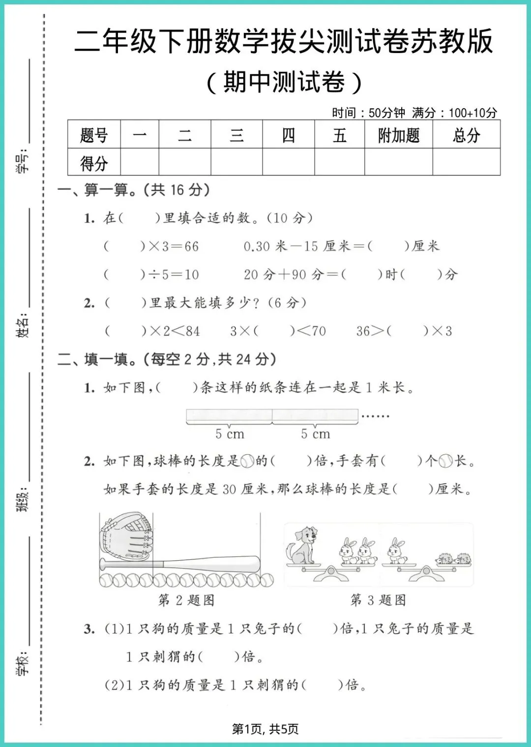 【免费下载】二年级(下)数学_期中拔尖测试卷《苏教版》 | PDF完整高清电子版可打印