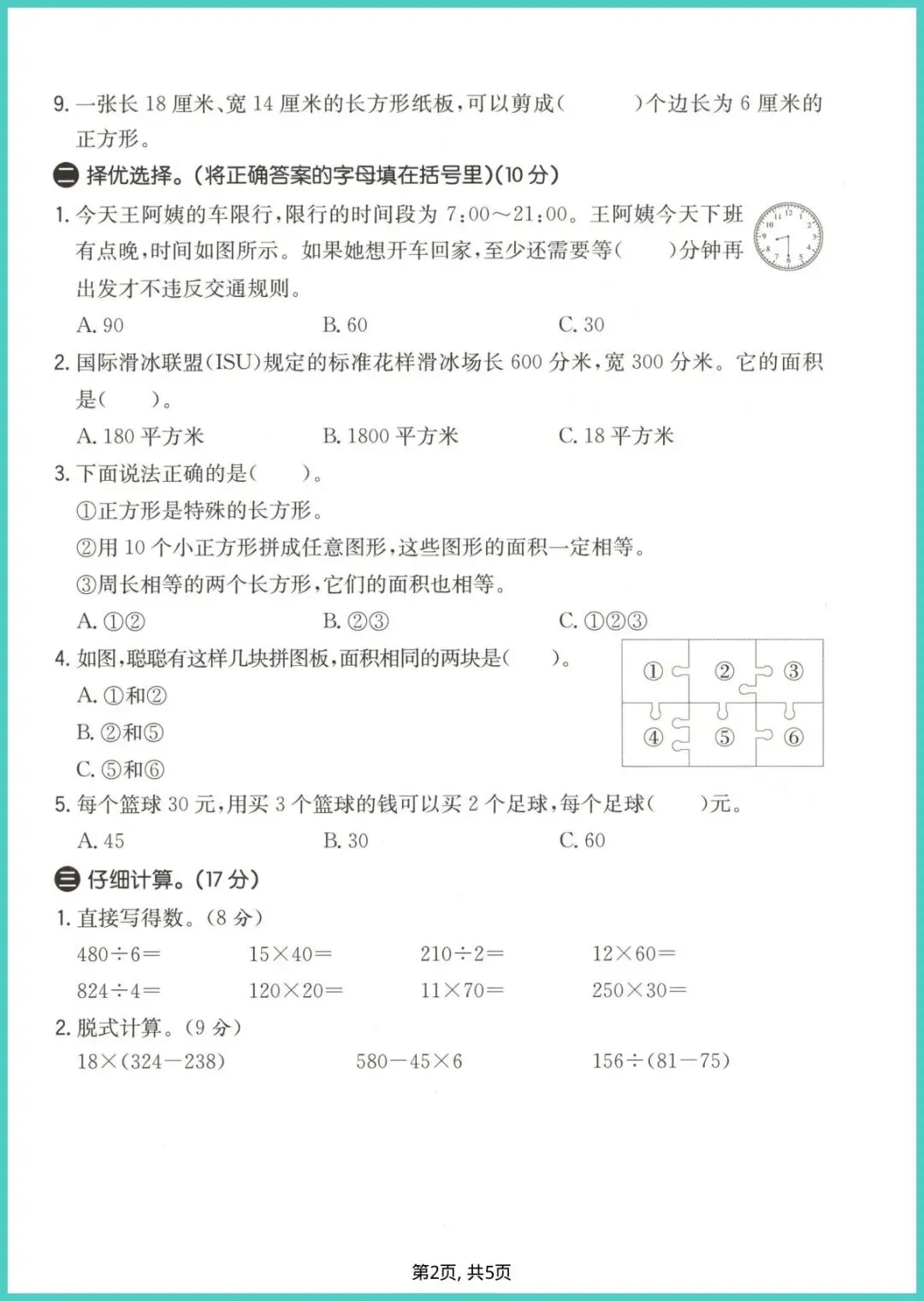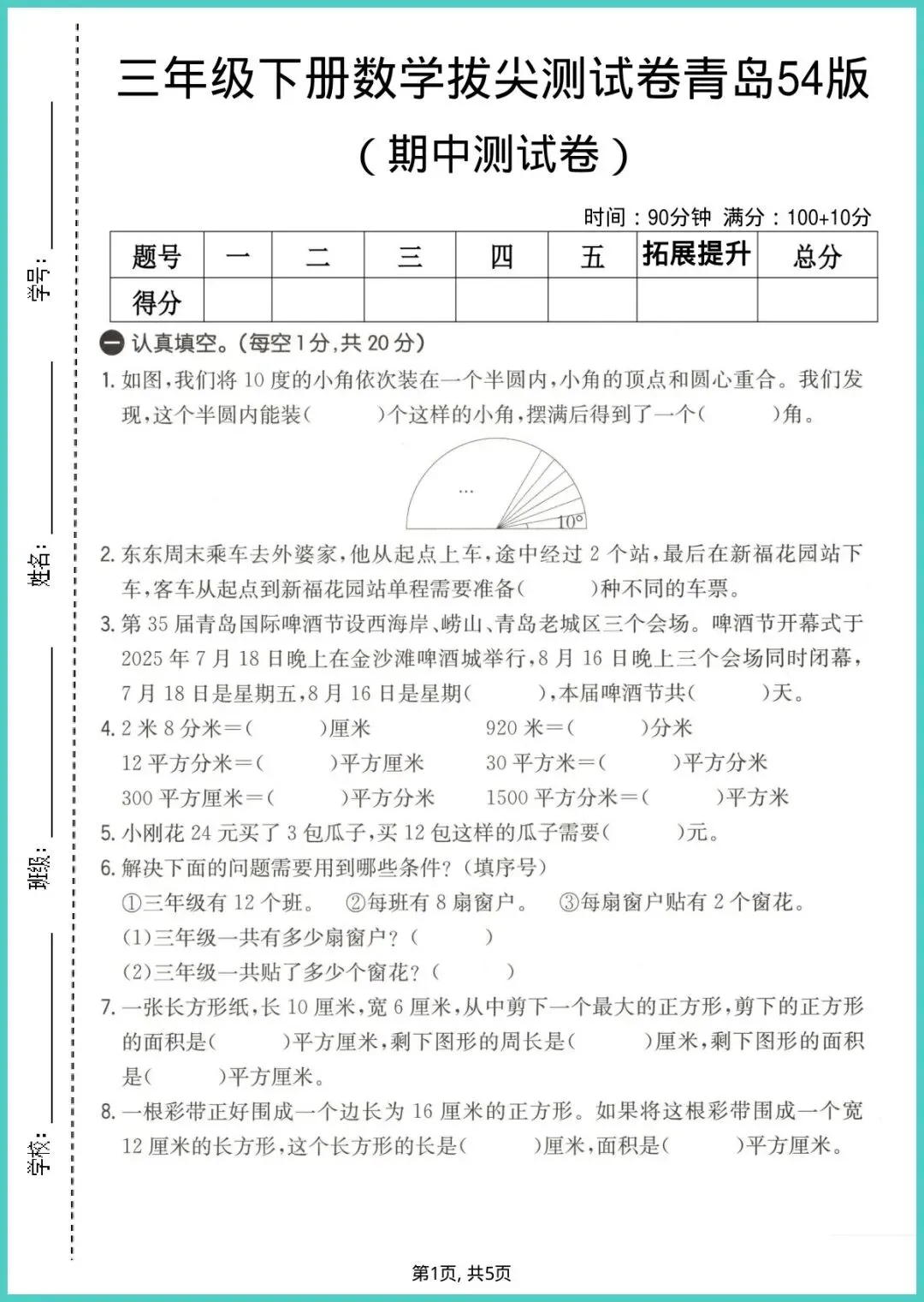 【免费下载】三年级(下)数学_期中拔尖测试卷《青岛54版》 | PDF完整高清电子版可打印
