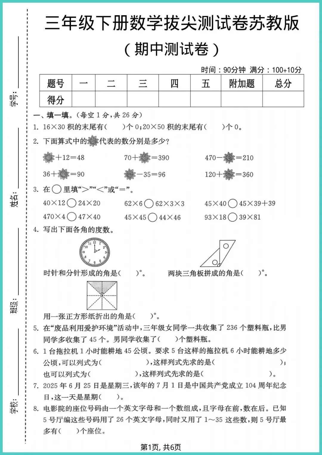 26年春苏教版三年级下册数学期中拔尖测试卷,新鲜出炉!6页精选题卡,紧扣课本重难点,涵盖计算、应用、图形、思维拓展四大模块,题型由浅入深,既练基础又拔高。每题配详细思路点拨,让孩子一看就懂,一练就会,迅速找到扣分点,期中冲刺提分不再慌。现在就把电子版存手机,下班回家打印一份,娃写完拍照对答案,10分钟搞定当天错题清零!想让孩子数学弯道超车?赶紧打印练起来,好资源不等人!
