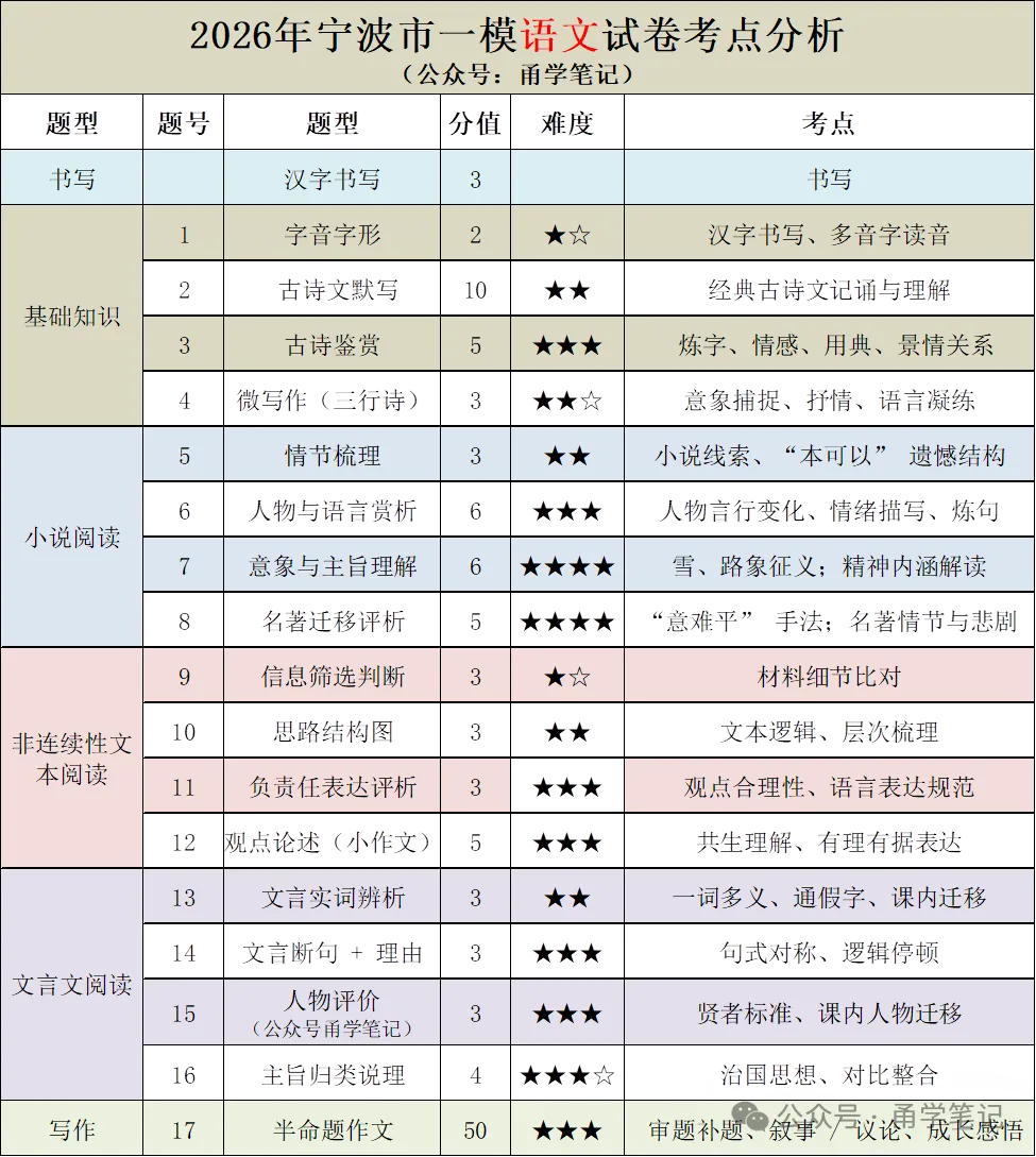 字音:宁波高频易错词每天 10 个(涧、淀、溯、晦、朔、绮、绮)2. 古诗文鉴赏(炼字 + 情感 + 手法)——背模板