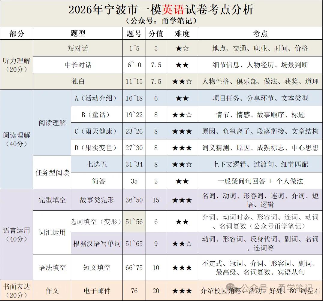一模偏难,中考更重 “规范 + 套路”核心方向:基础不丢分、阅读套路线、作文稳二类上