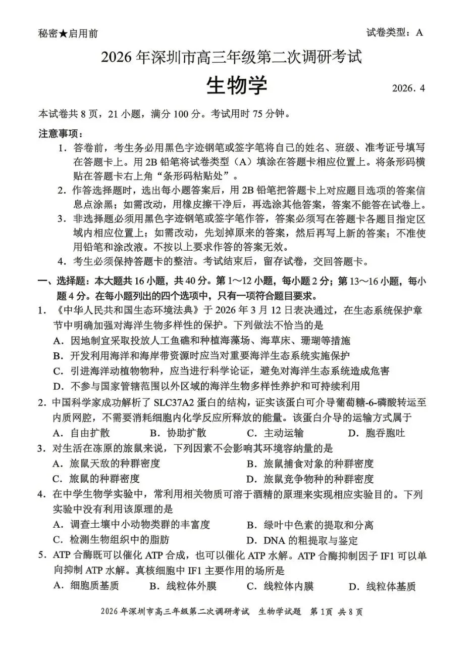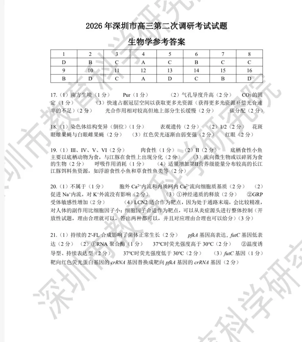 【深圳二模来袭】2026年深圳二模生物试卷+评分标准