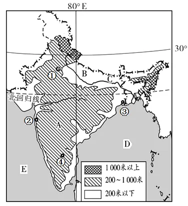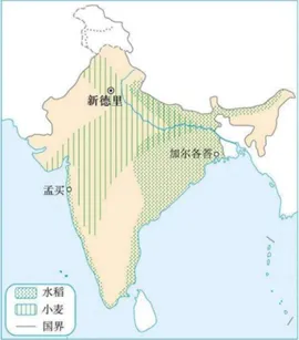 (1)印度的地形区分为三部分: