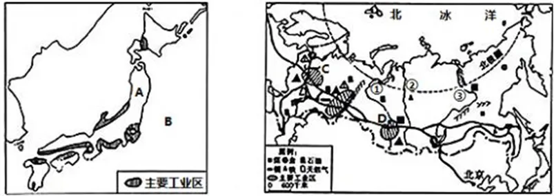(4)两国工业分布都不均匀,俄罗斯的工业主要分布在原料产地。日本的工业主要分布在B 沿岸,请分析主要原因。