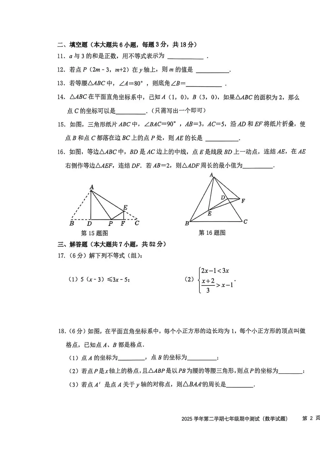【2026浙江七下数学试卷】温州市瑞安市安阳实验中学七下第二单元数学测试(2026.3)