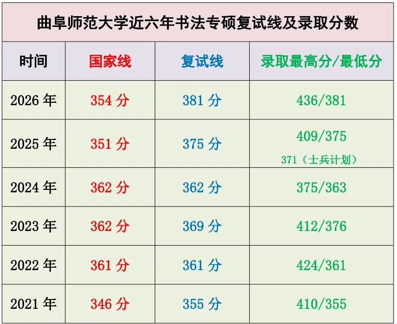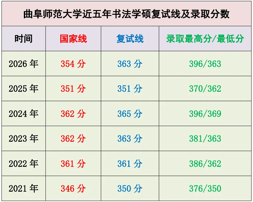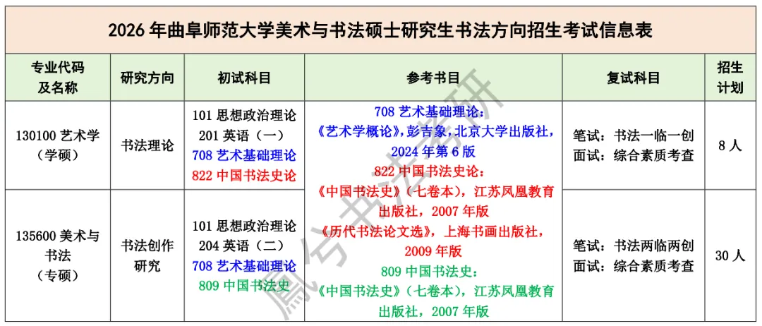 2026年曲阜师范大学美术与书法学院招生书法硕士研究生,设置艺术学(学硕)书法理论和美术与书法(专硕)书法创作研究两个方向;一志愿学硕(艺术学专业,书法理论方向)进入复试8人(鳳兮3人),复试划线363分,拟录取7人(鳳兮2人),鳳兮邬同学取得本年度总分第一(396分),中国书法史论单科第一(142分);一志愿专硕(美术与书法专业,书法创作方向)进入复试45人(鳳兮6人),复试划线381分,拟录取32人(鳳兮5人),鳳兮罗同学取得本年度总分并列第二(412分),中国书法史论单科136分。以下为鳳兮书法考研整理的相关资讯,供27年备考学生参考。