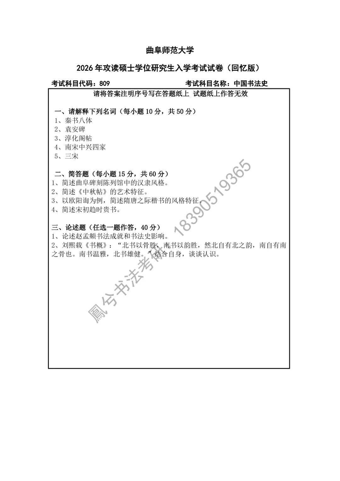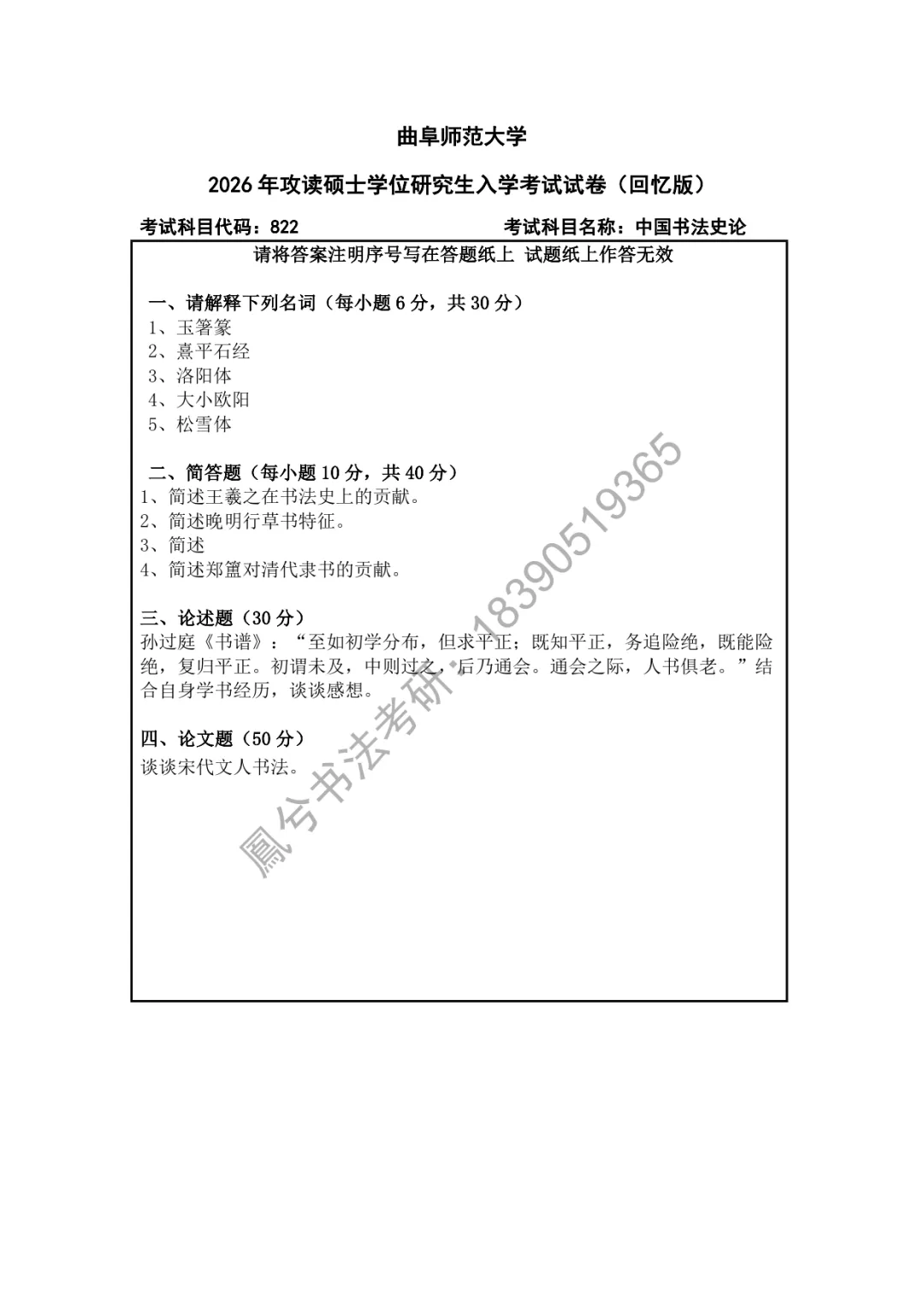 书法考研真题 | 近五年曲阜师范大学书法史论科目真题汇总(22年—26年)