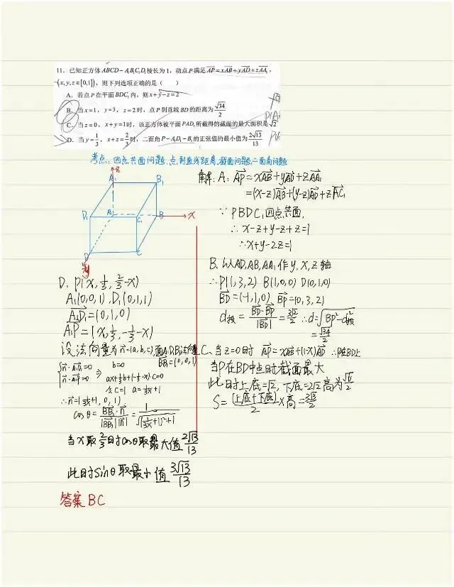 多选第11题,正方体背景下的空间向量压轴,并结合动点求最值问题,有一定的难度。