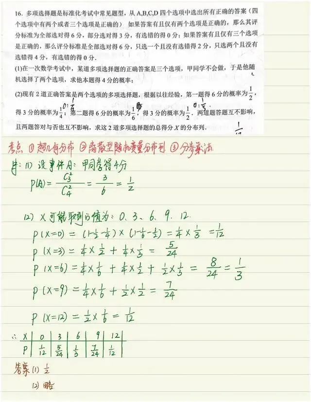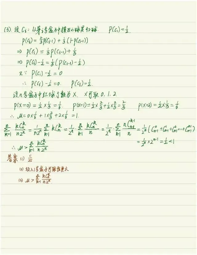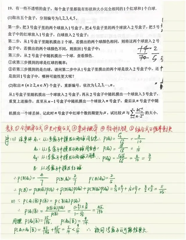 解答第19 题,第一小问全概率公式,第二小问贝叶斯公式,第三小问概率和数列的结合,马尔科夫链,另外还考查组合式的变形化简。