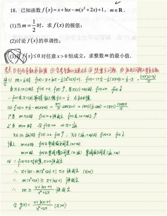 解答第18题,第二小问考察导数含参的分类讨论,第三小问考查恒成立问题下的参变分离,并结合隐零点问题。