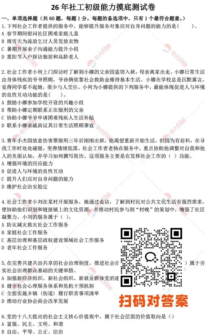 2026年社工考试倒计时27天!备考黄金冲刺阶段已然开启!一套高质量摸底试卷,帮你全面查缺补漏、吃透考试题型、掌握答题技巧,快速提升应试水平,高效冲刺提分!
