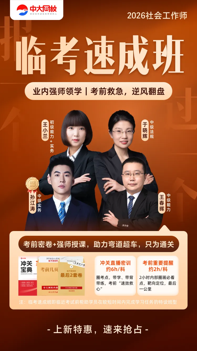 2026年社会工作师考试新版教材章节繁多、知识点庞杂,中大网校针对新版教材精心研发了各科目思维导图 、章节试题 、初中级各科目50个必会考点、新增考点必做题等资料,帮助考生掌握核心考点、提升答题技巧,实现高效备考,考生可添加助教老师微信咨询获取哦。