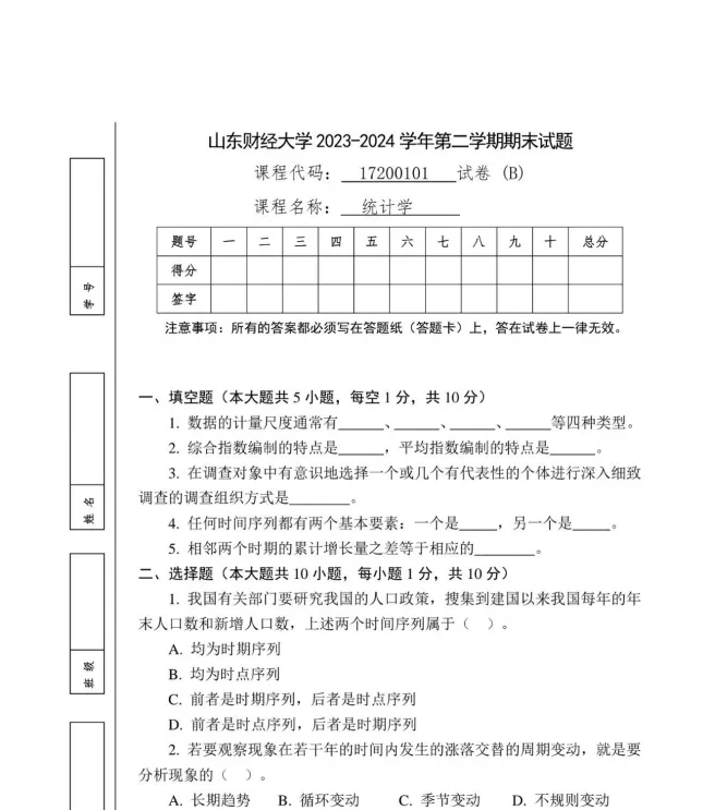 山东财经大学《统计学》2023-2024学年第二学期期末试卷B卷.pdf