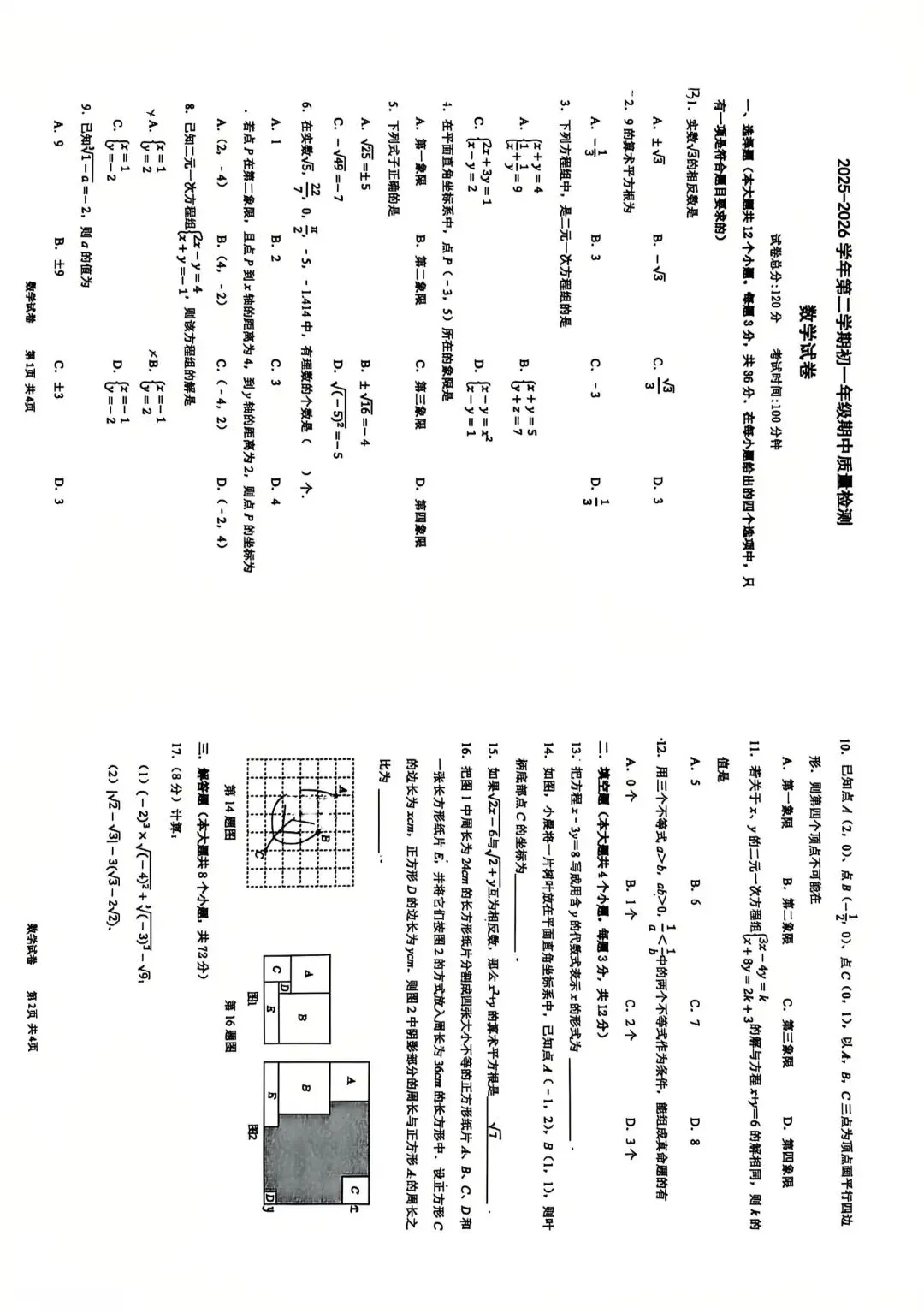 2026年七下数学期中试卷,有答案