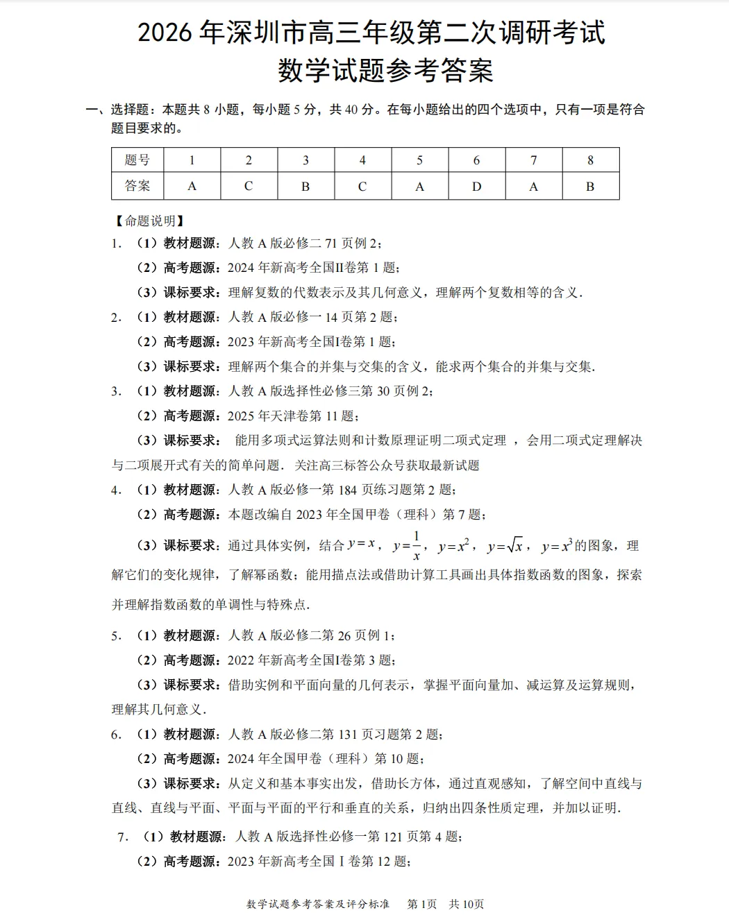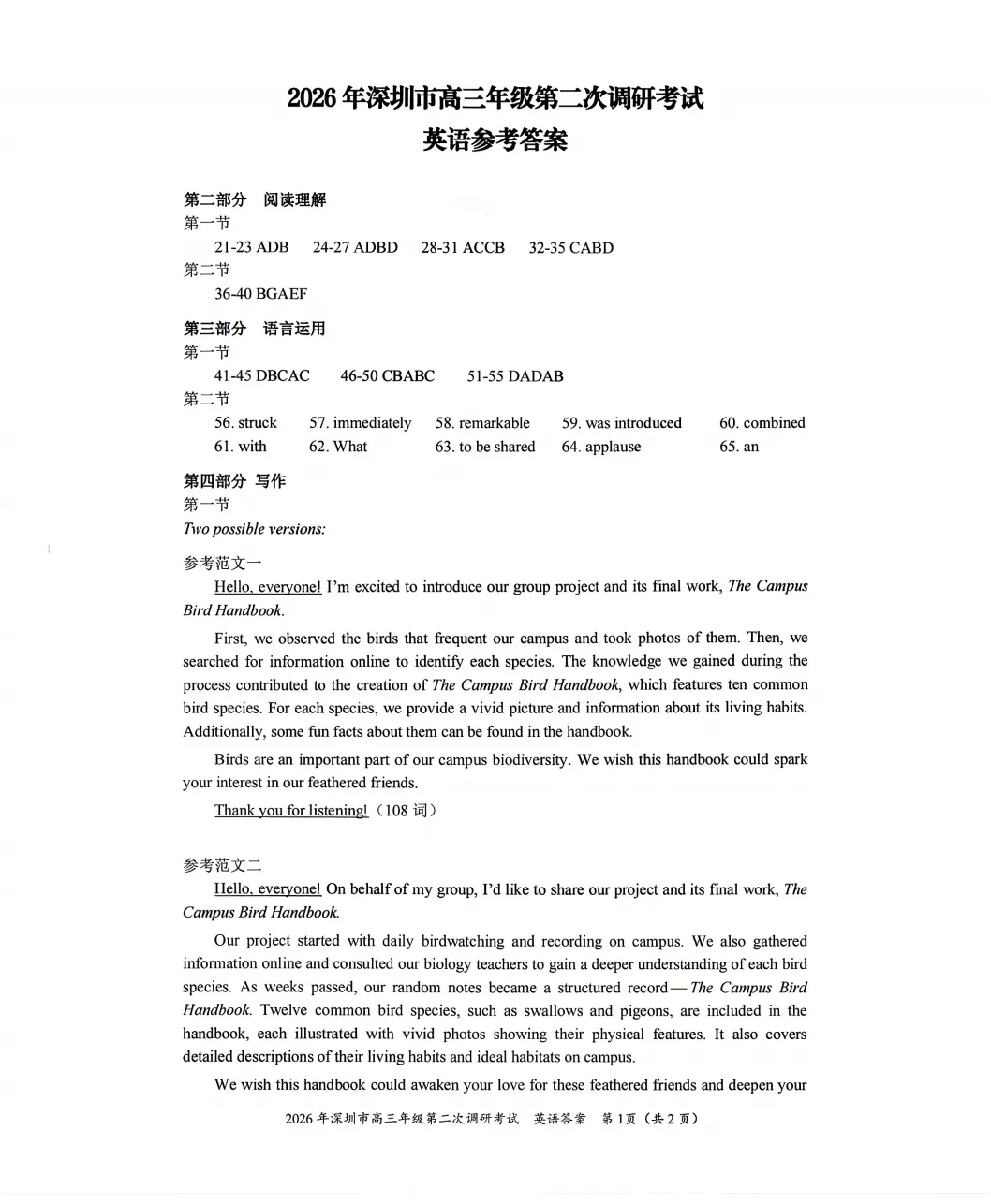 2026年深圳市高三二模【全科】真题试卷及参考答案