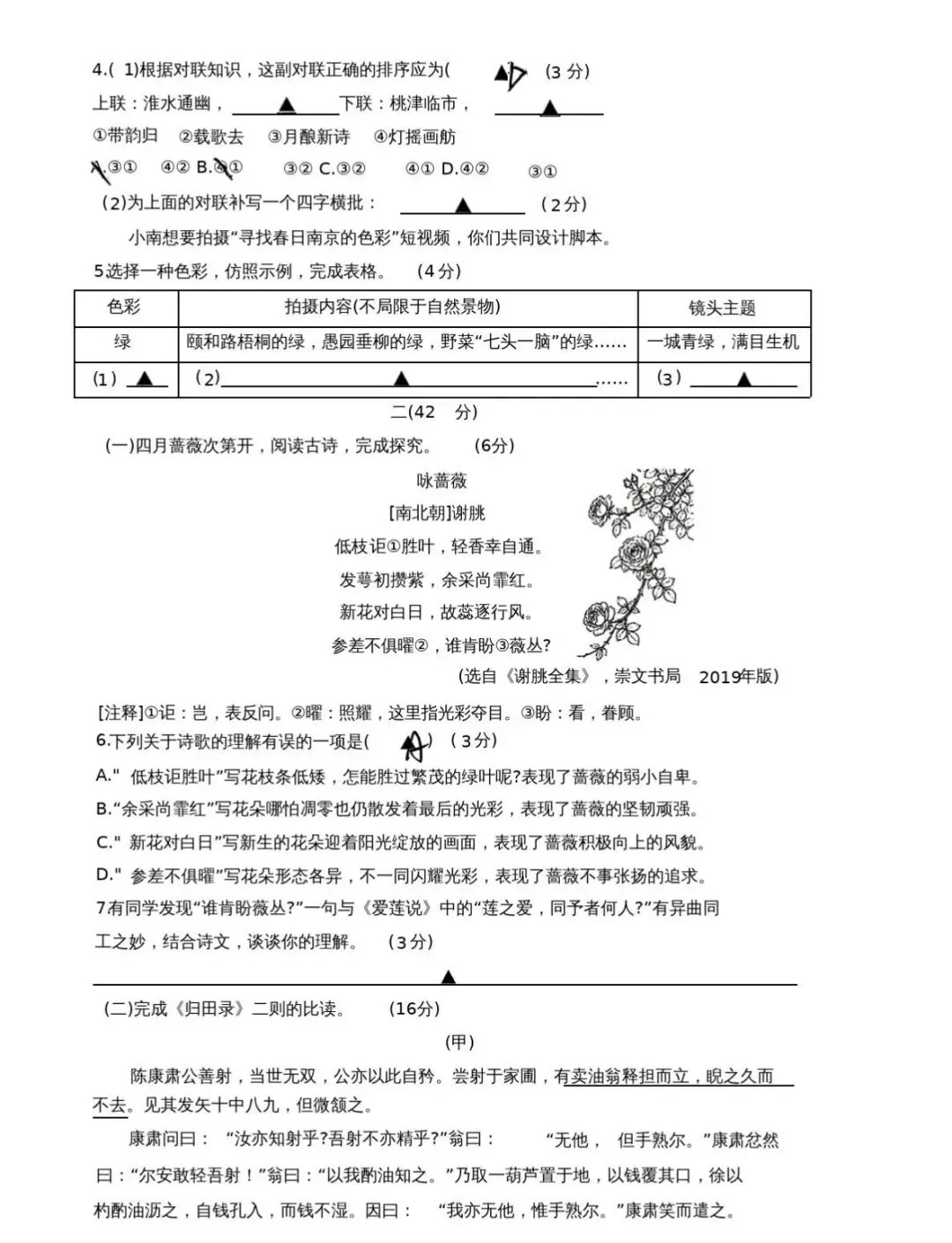 - 古诗词鉴赏第6题:《咏蔷薇》选项A对"低枝讵胜叶"的理解,错误选项设置得很"像"正确答案,容易踩坑。