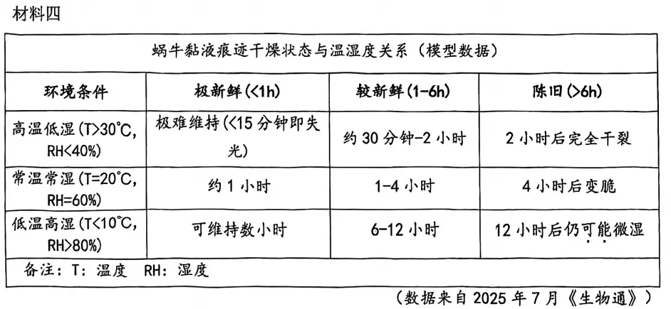 14.请分析材料四数据,就蜗牛黏液痕迹干燥状态与温湿度之间的关系写一条结论。(2 分)