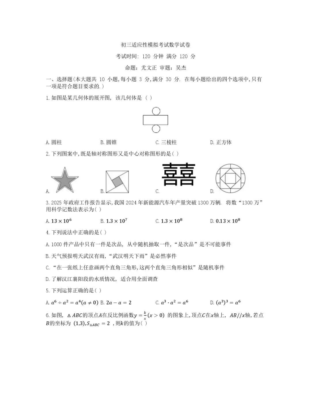 2026年广州大学附属中学中考一模数学试卷,每题涉及的考点信息拆解如下(下载试卷完整版请拉至本文末尾):一、选择题(1-10题,每题3分,共30分)