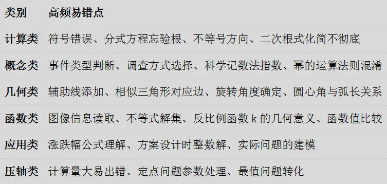 2.中档题(18-22题):规范解题格式,注意分式方程验根、不等式组整数解、统计图表信息提取