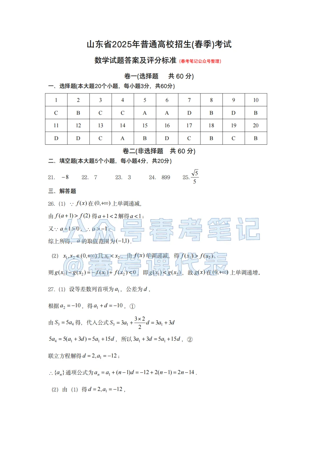 >25年春考数学真题-答案解析(PDF可下载)
