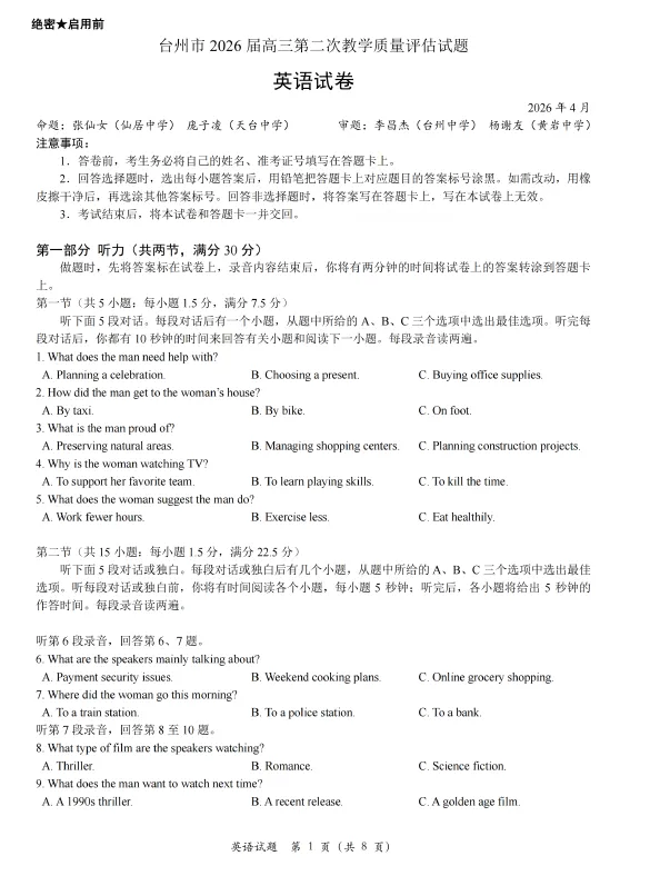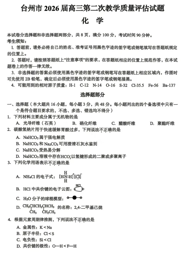 >【高三试卷】浙江台州市2026届高三第二次教学质量评估(全科)