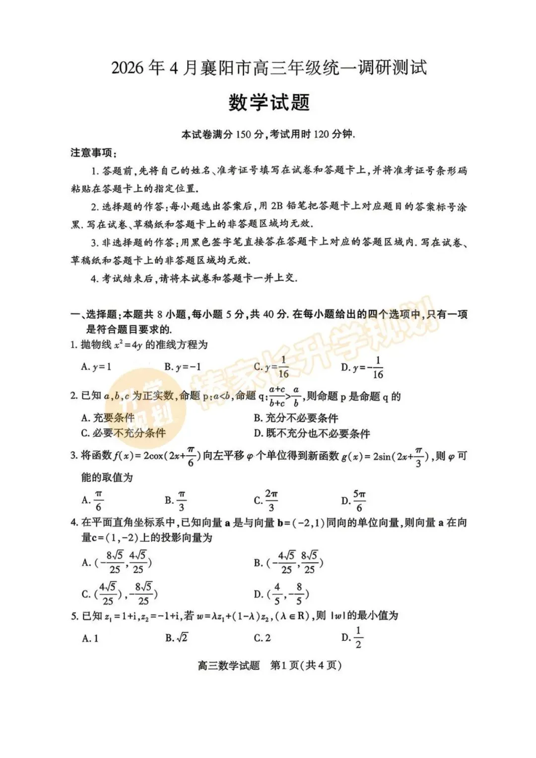 回复【襄阳】,领取2026襄阳高三4月联考试卷答案