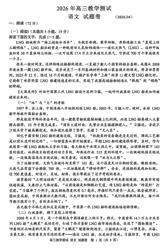 2026年 静安初三语文二模试卷(含参考答案)