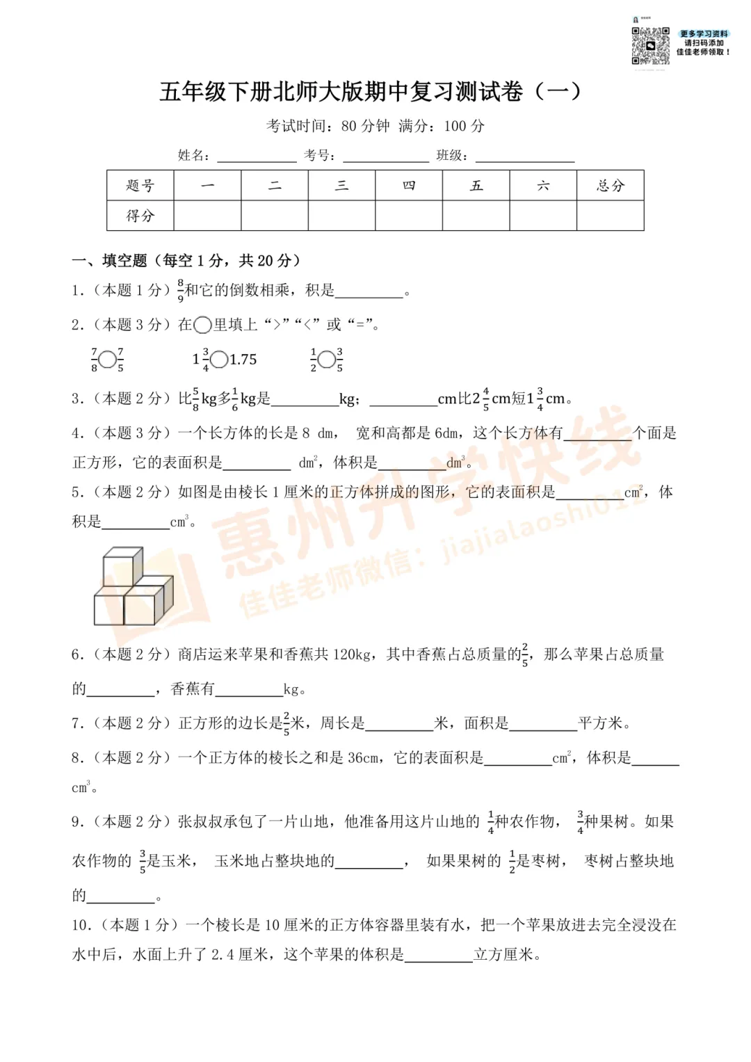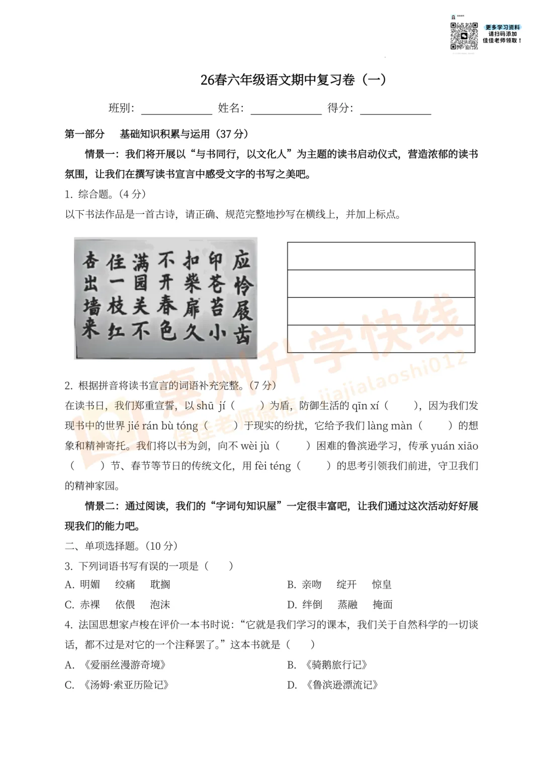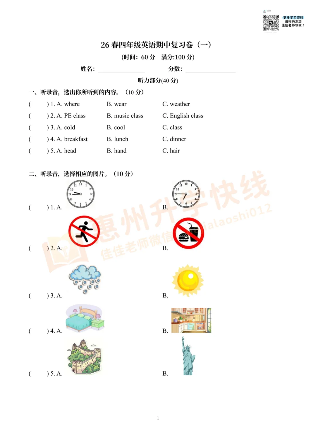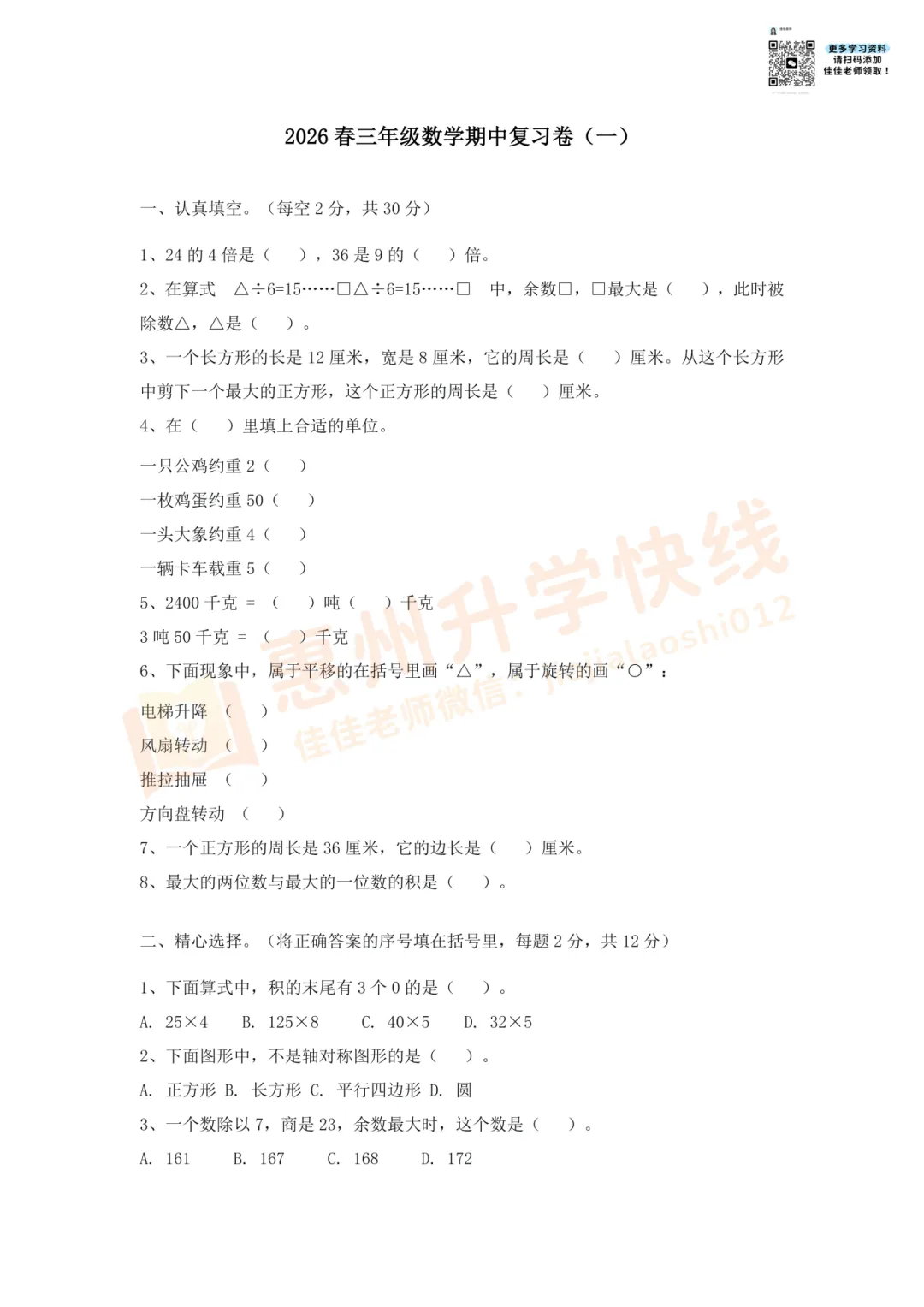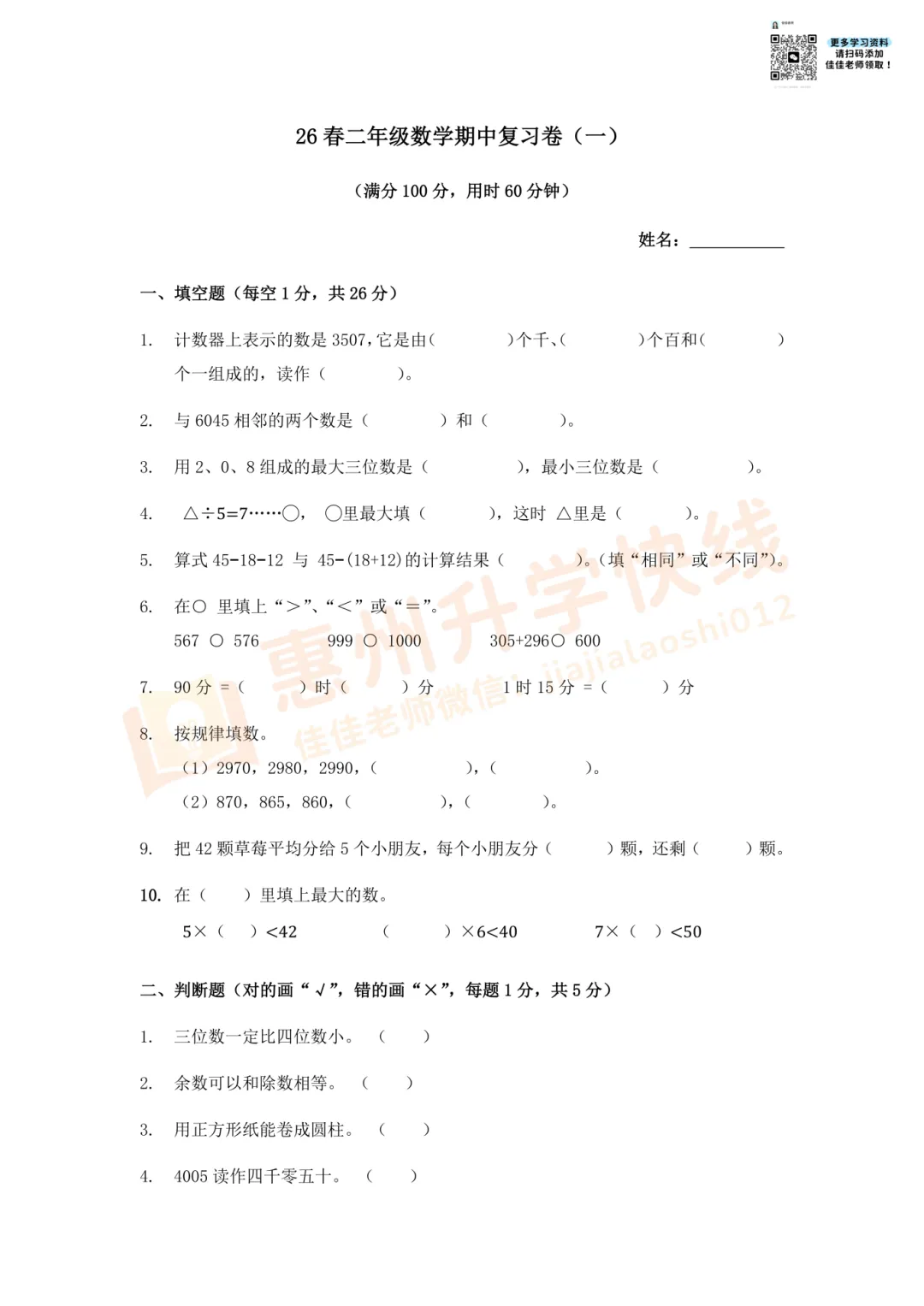 因篇幅有限,仅展示部份试卷。有需要完整版试卷+答案的家长,可扫码进入【惠州2026小升初学习交流群】,回复【期中】,即可免费领取哟!更多学习资料、升学资讯,持续更新中……