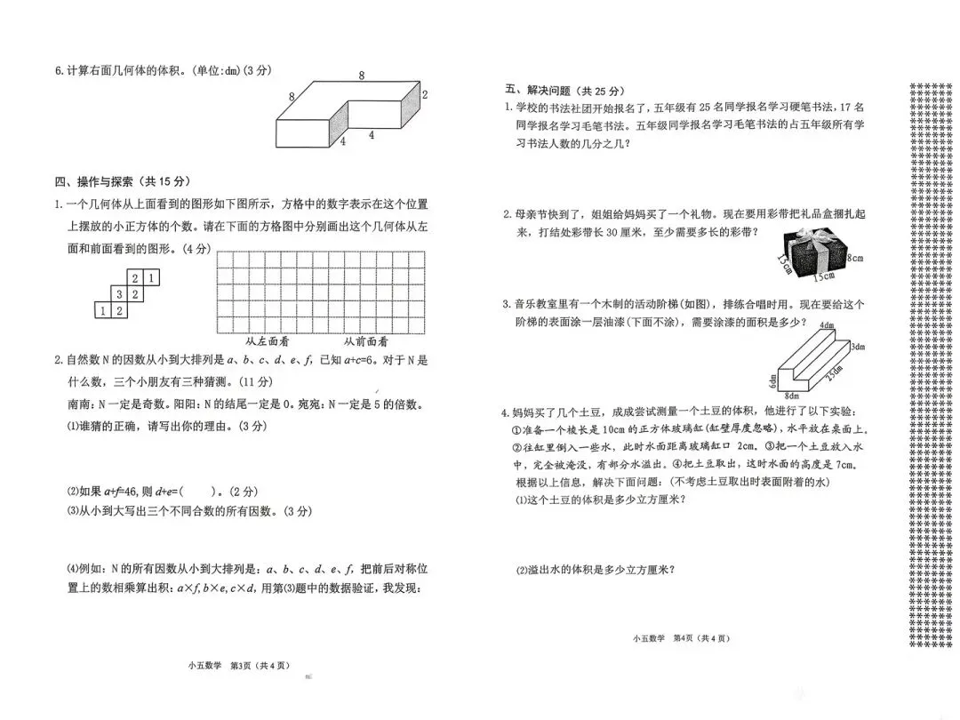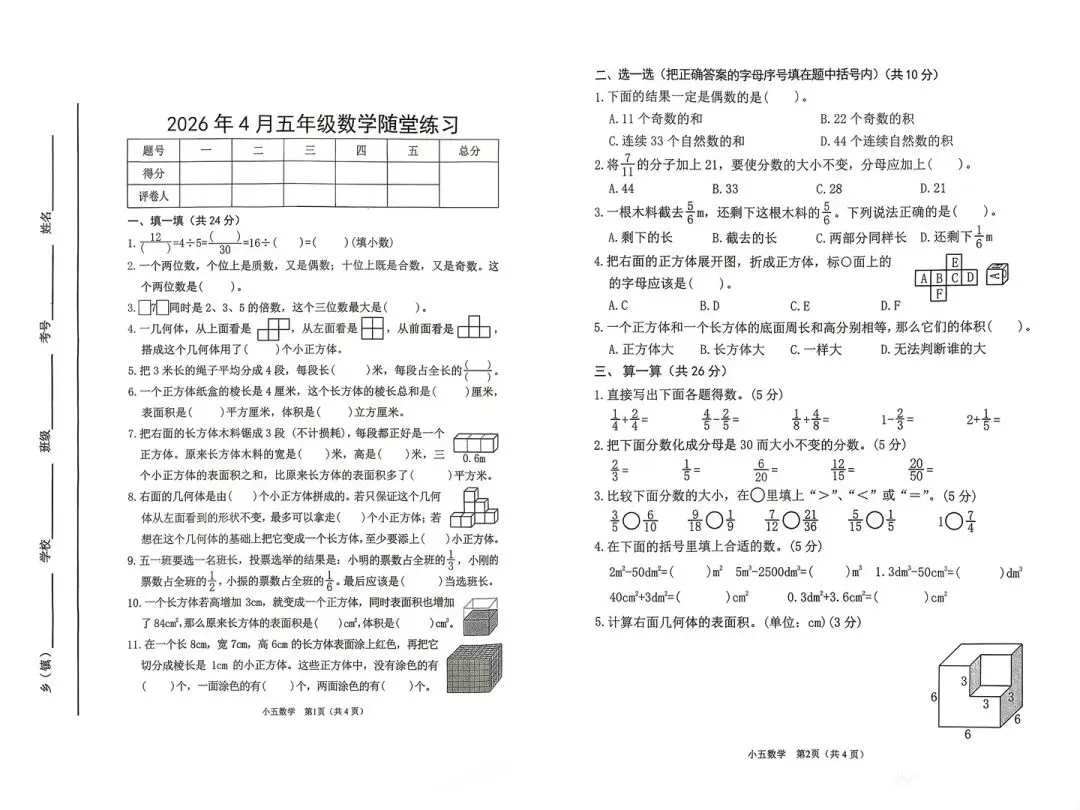 试卷打破了单元壁垒,实现了知识的跨模块融合(如分数与因数倍数、长方体与单位换算),引导学生构建结构化的知识网络。