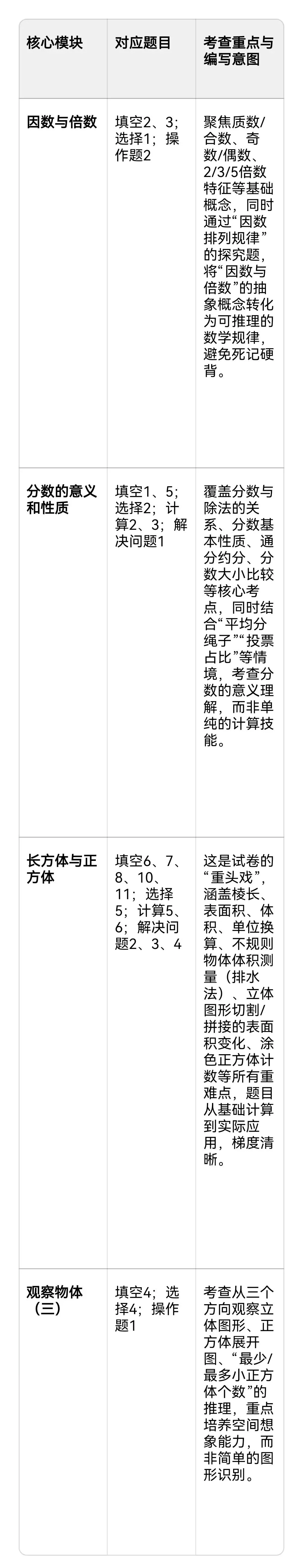 这份试卷完全贴合人教版五年级下册数学教材的核心模块,紧扣新课标“核心素养导向”的命题趋势,以下从知识维度、素养维度、教学导向三个层面做深度拆解: