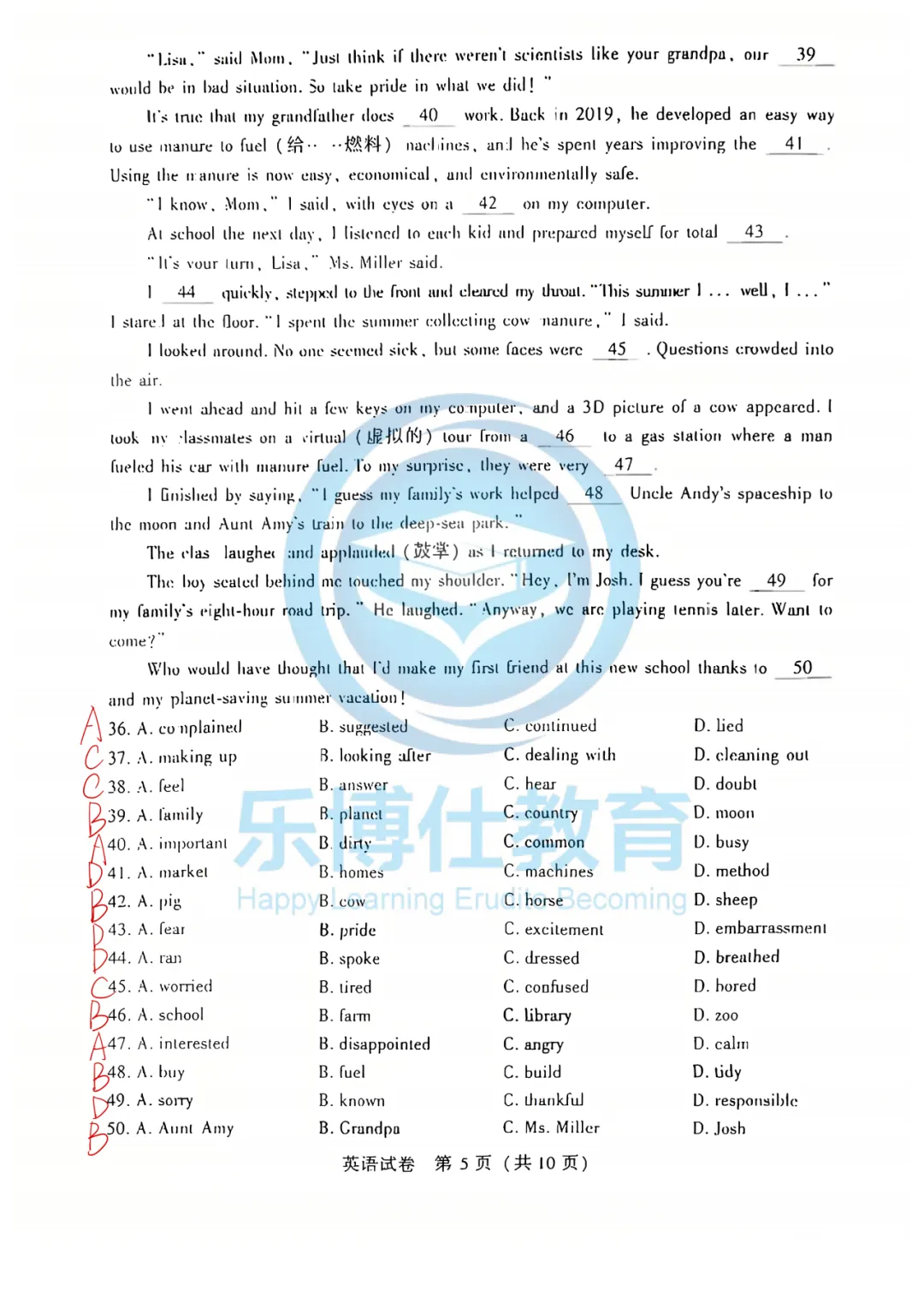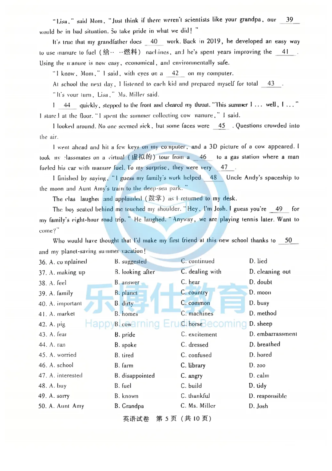 完形填空15分(难度0.65-0.7):记叙,难度适中,偏重语篇理解以及词汇在具体语境中的运用。考查重点为实词:即名词、动词、形容词;其中动词辨析5题(含短语),名词辨析6题,形容词辨析4题。全篇词数500左右,4个生词(已释义),不影响阅读。