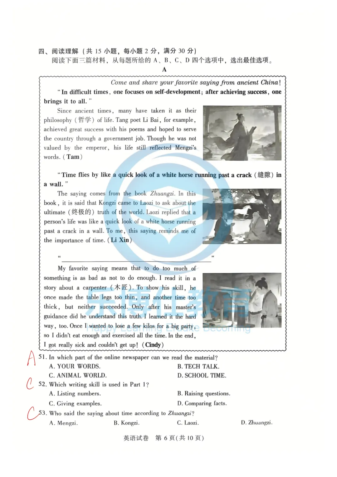 A篇(难度系数0.65):古代中国名人名言,3个生词均已释义,以推理判断题为主;