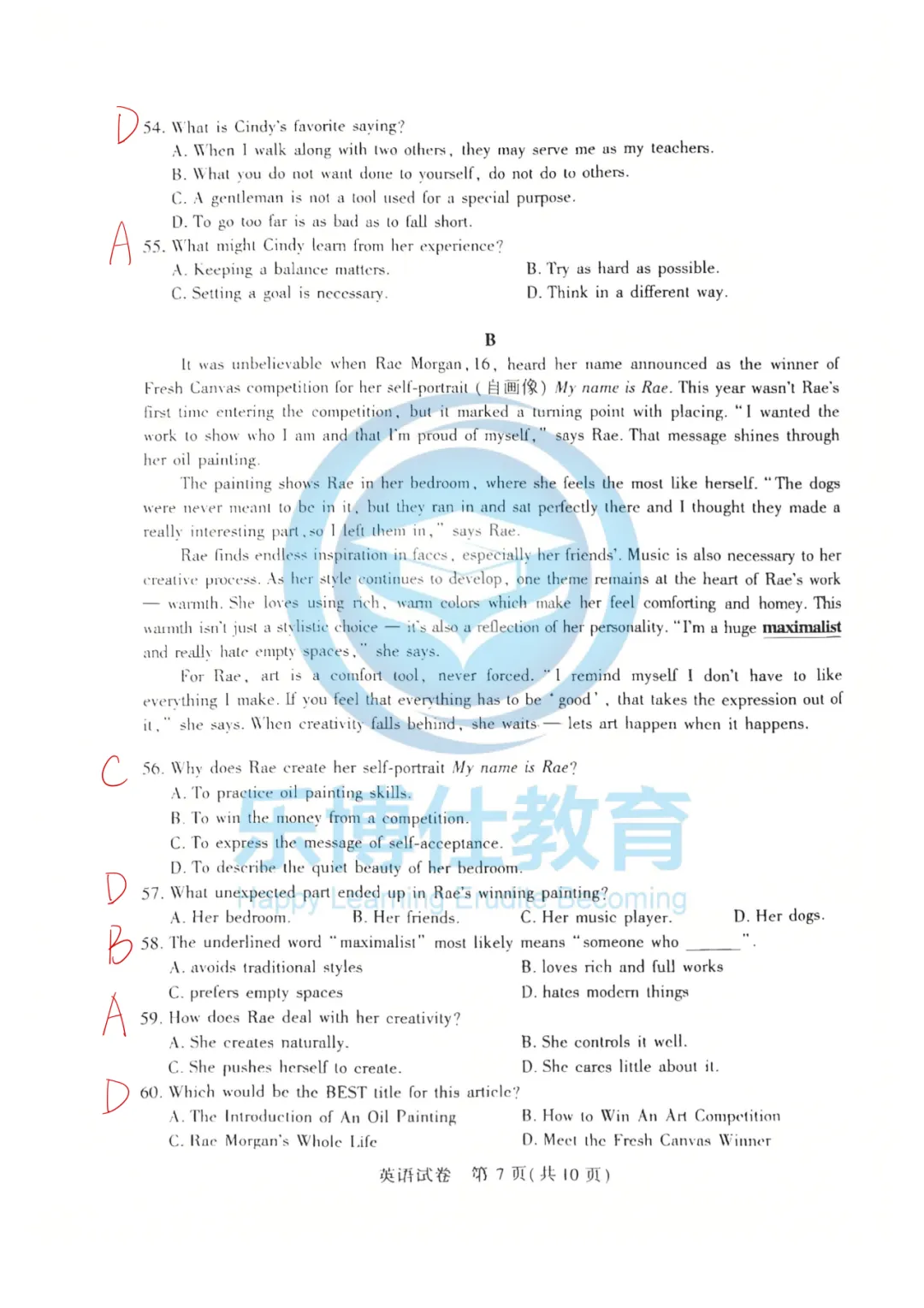 56题考推理判断,原文对应:I wanted the work to show who I am and that I’m proud of myself.