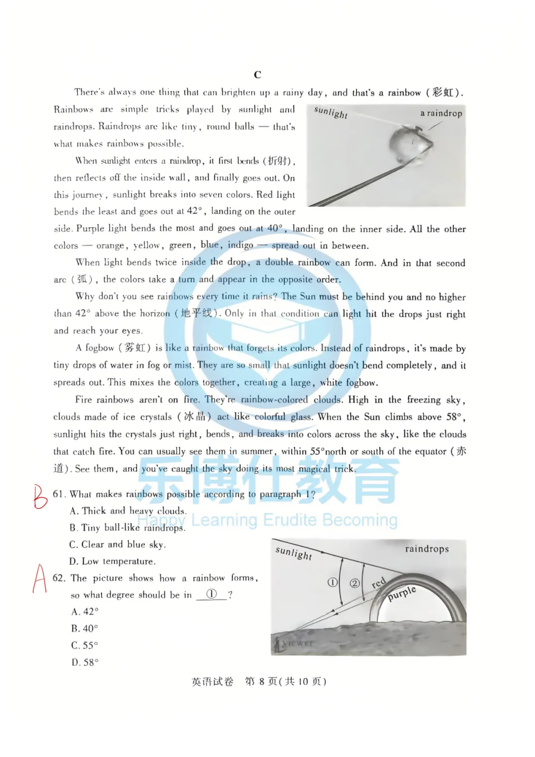 62题:考细节理解,解题关键在于正确定位信息;原文对应:Red light bends the least and goes out at 42 degrees;