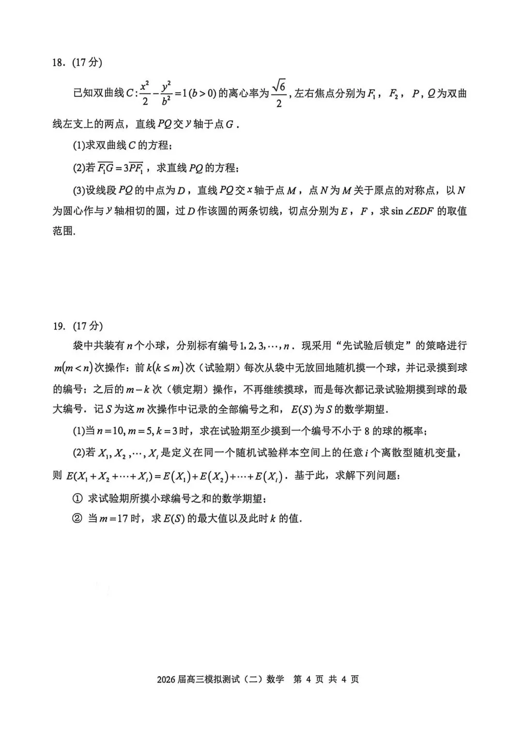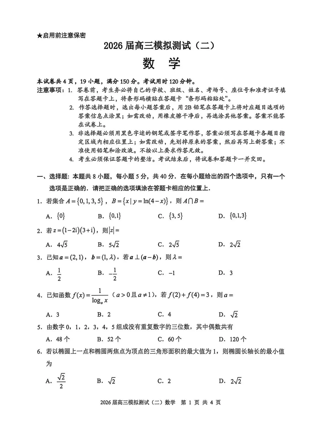 【试卷+答案】2026年4月天域全国名校协作体高三联考—高三数学