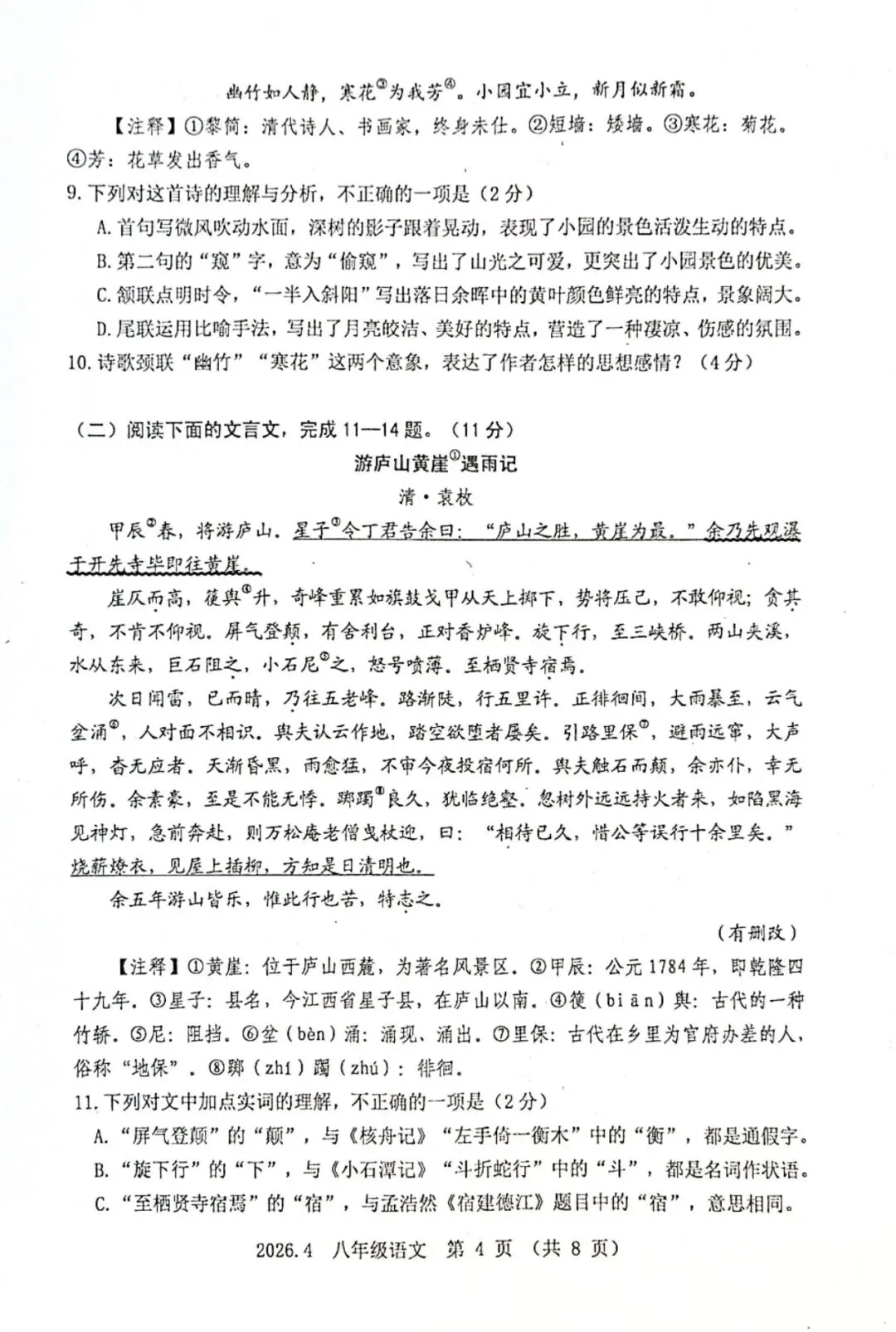 9.(2分)D(从全诗的主题来看,“新月似新霜”营造了一种静谧、洁白的氛围,而非“凄凉、伤感”。)