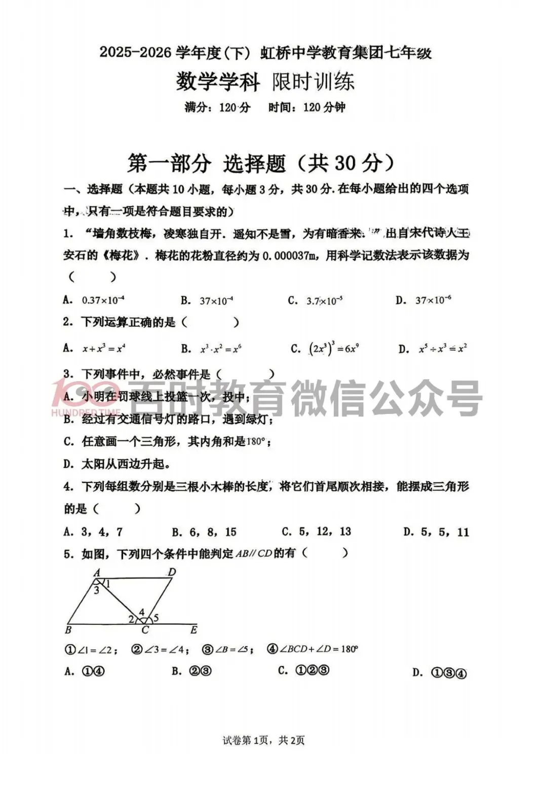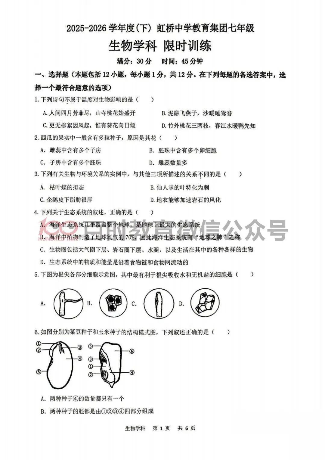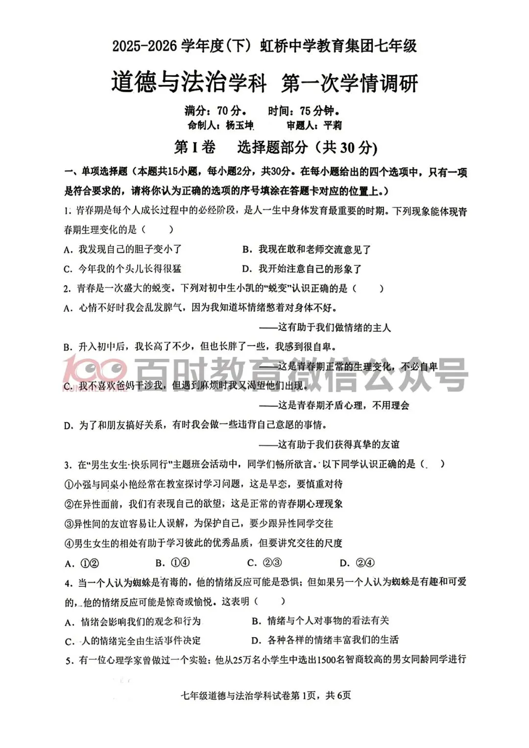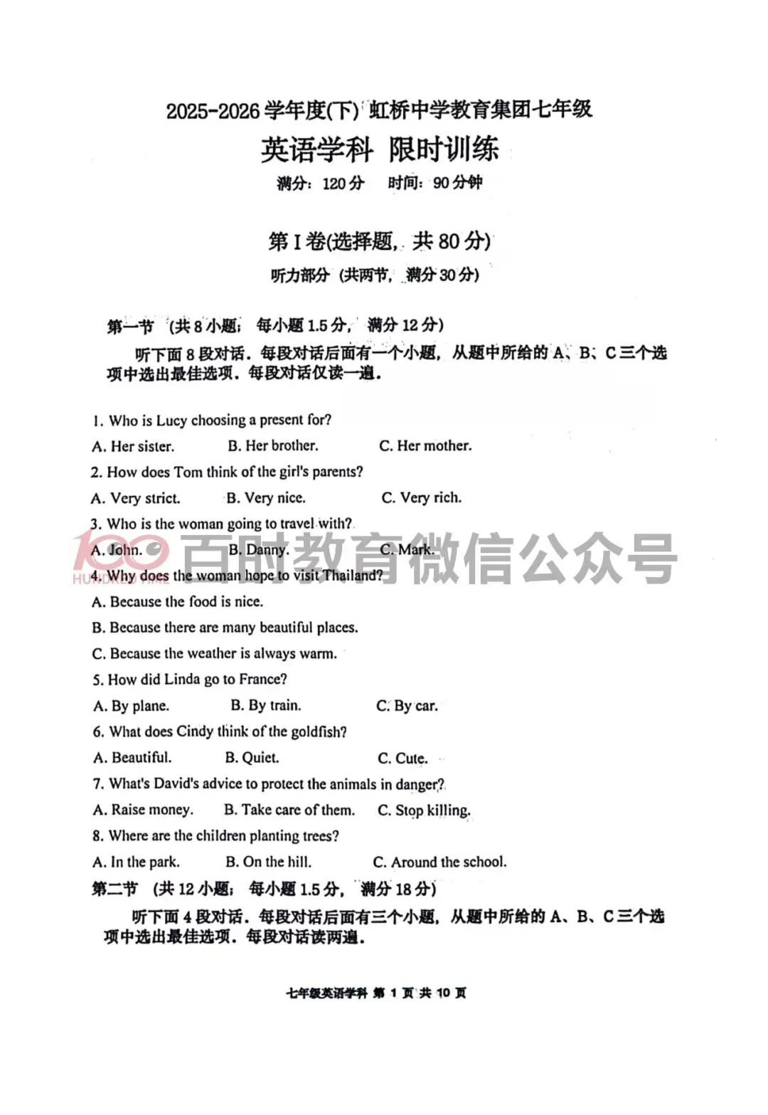 >初一试卷!2026年4月虹桥中学期中试卷+答案!可下载!