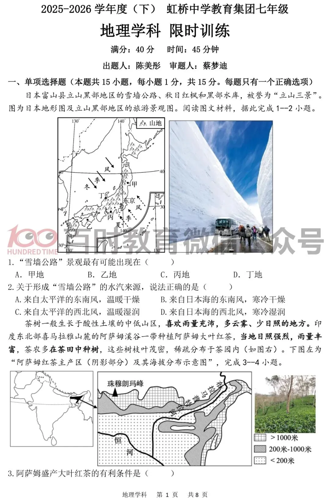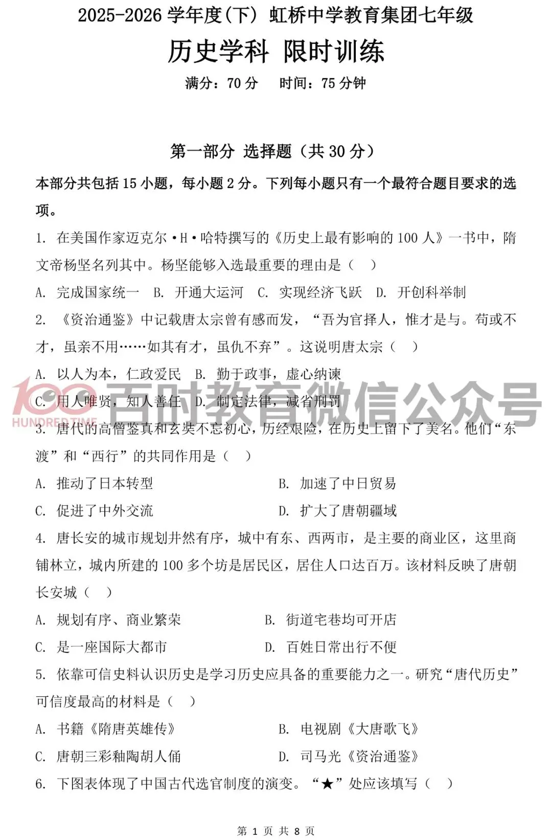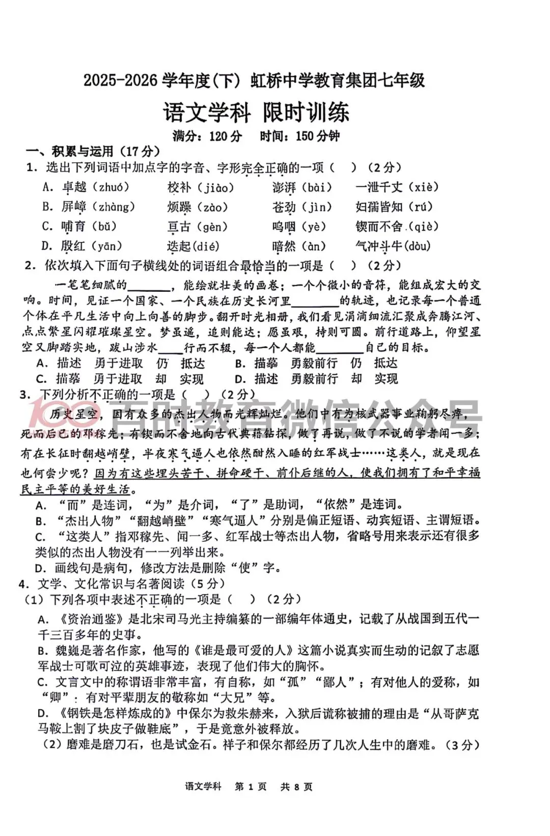 初一试卷!2026年4月虹桥中学期中试卷+答案!可下载!