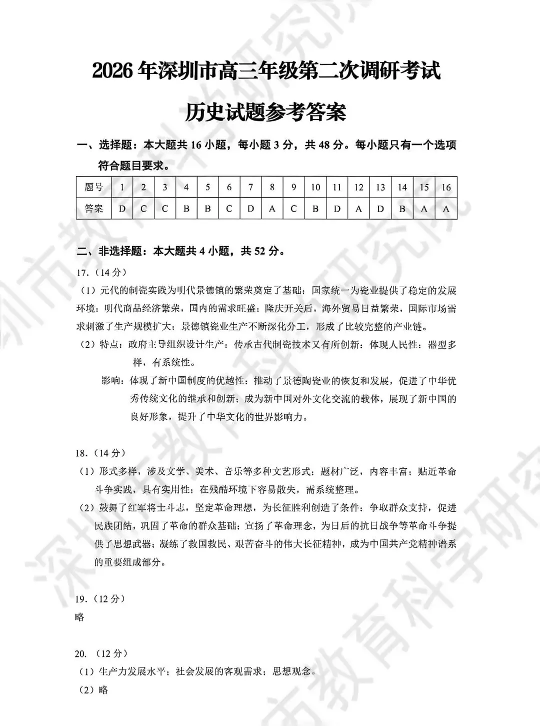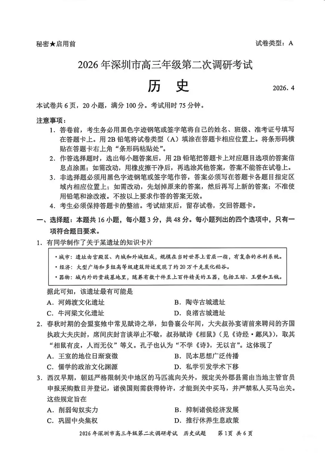 试卷分享丨 2026 年深圳二模历史试卷及参考答案
