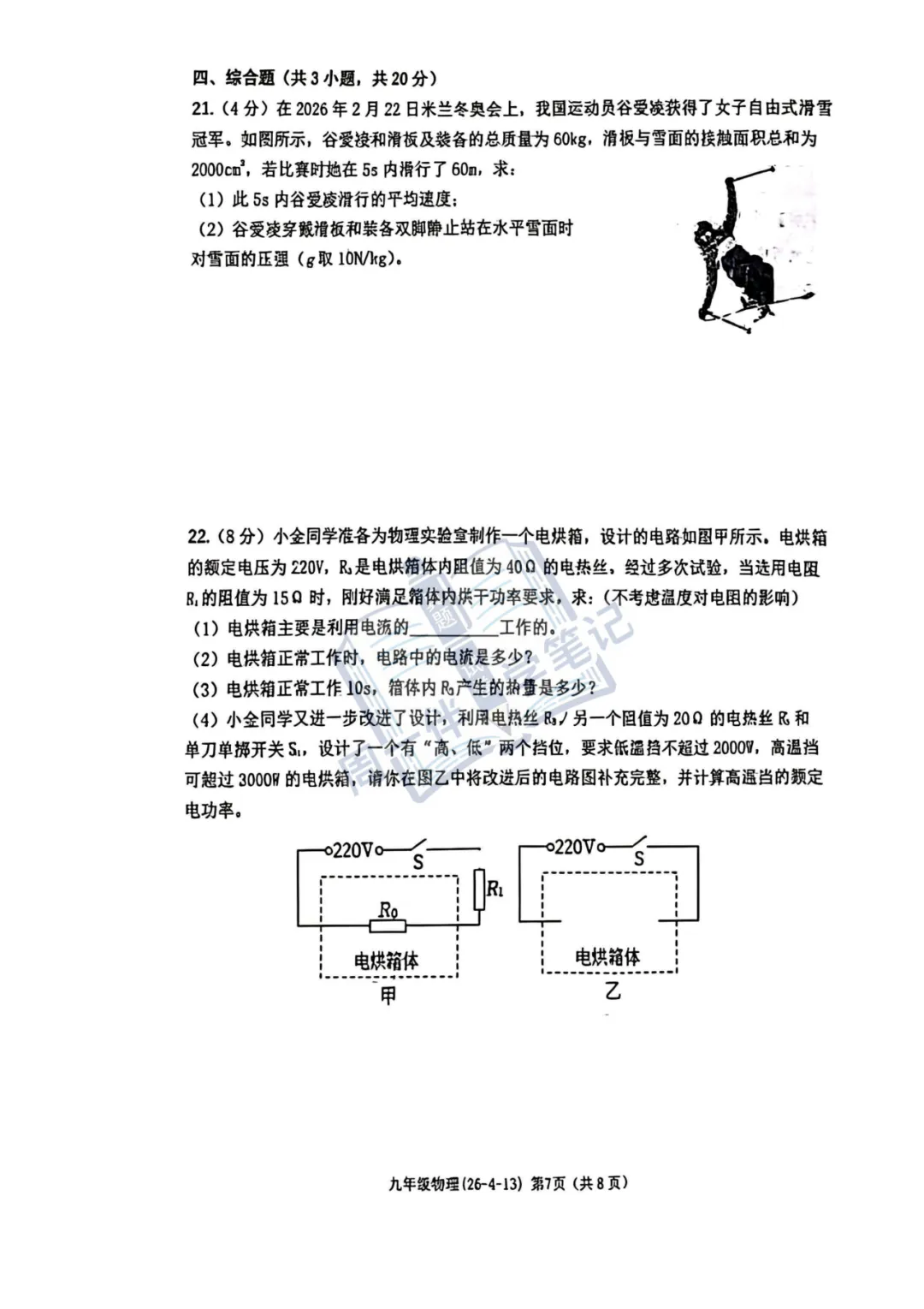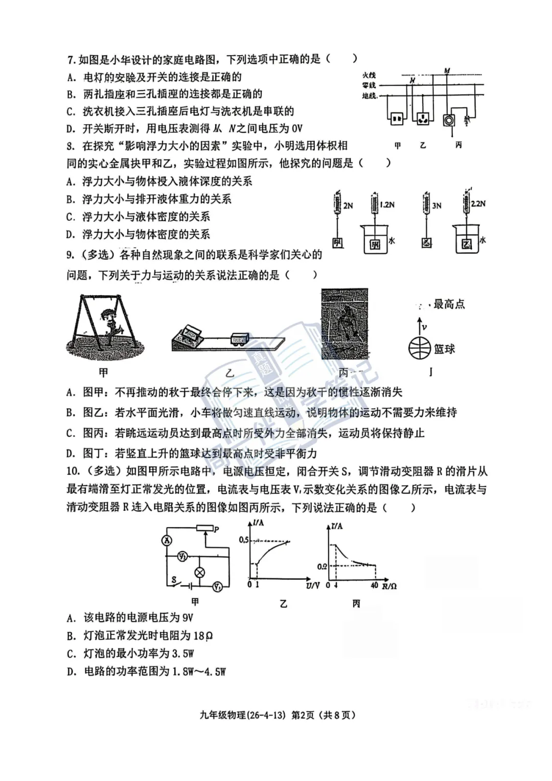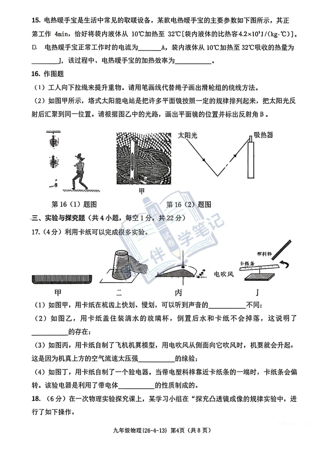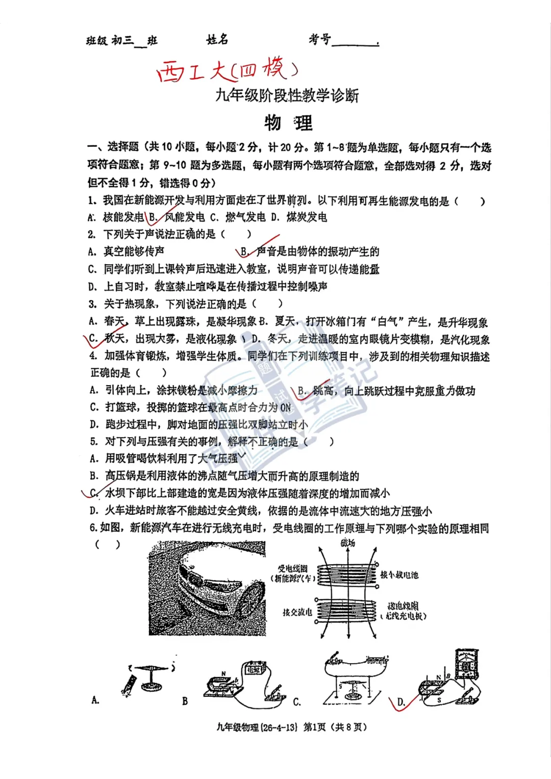 本次分享为西安地区【初三试卷】2026年西工大物理四模试卷+答案解析(可打印),适合九年级同学自测练习。