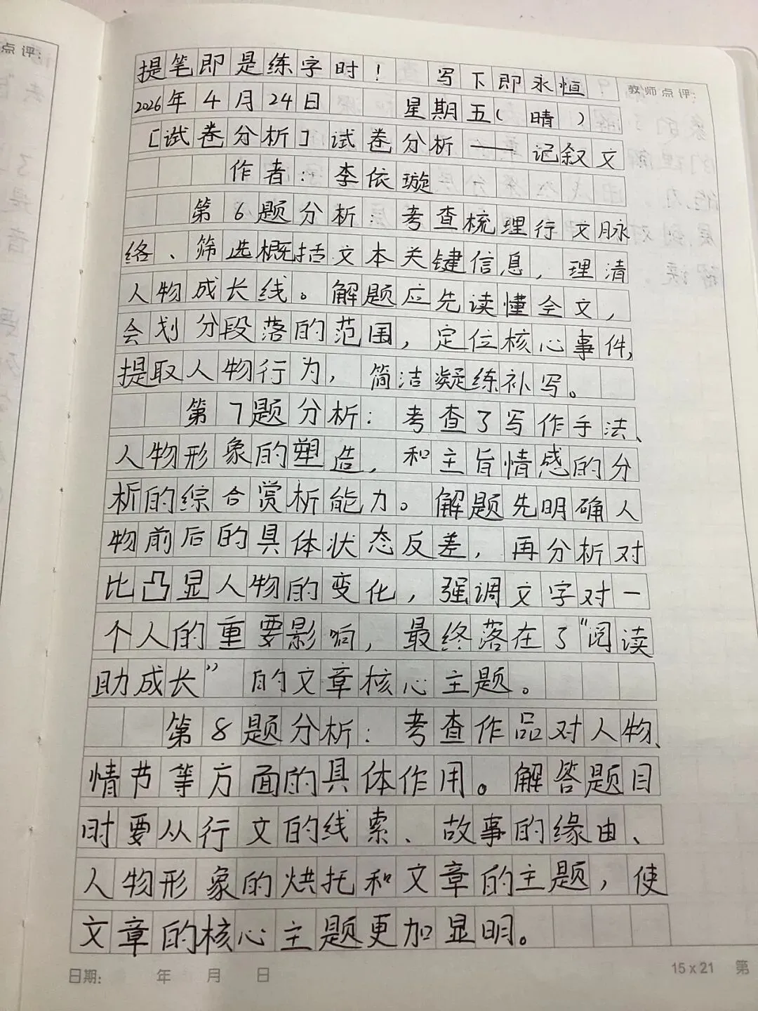 第7题分析:考查写作手法、人物形象塑造,以及主旨情感分析的综合赏析能力。解题先明确人物前后的具体状态反差,再分析对比凸显人物的变化,强调文字对一个人的重要影响,最终落脚在“阅读助成长”的文章核心主题。