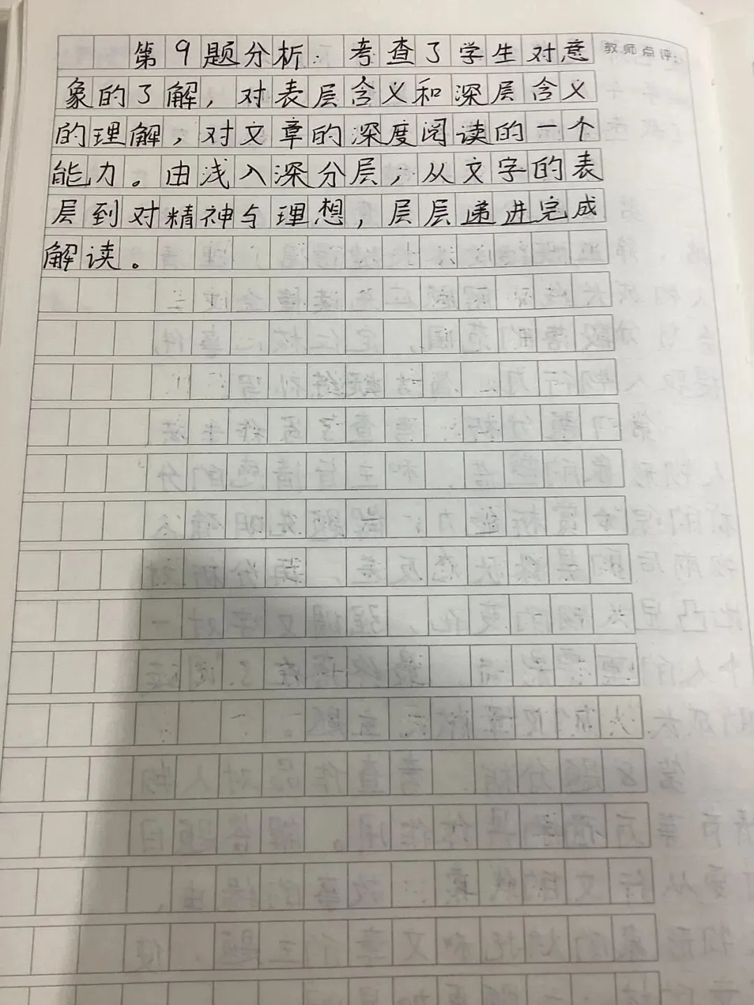 第9题分析:考查学生对意象的认知、对表层含义和深层含义的理解,以及深度阅读文本的能力。由浅入深分层解读,从文字的表层内涵延伸到精神与理想层面,层层递进完成深度解读。