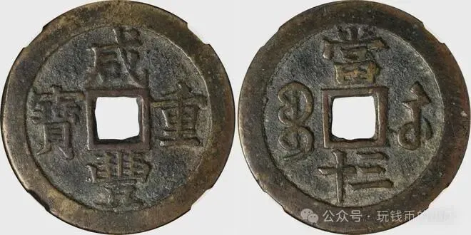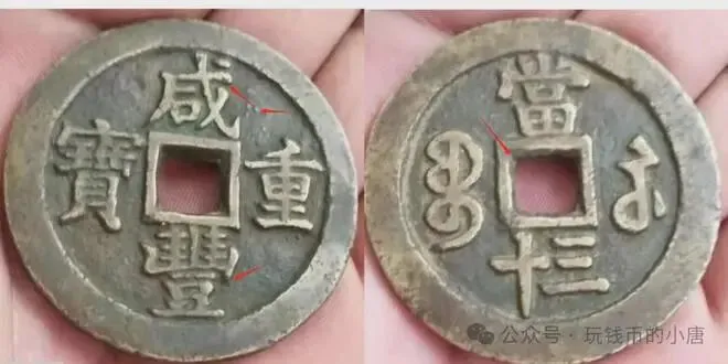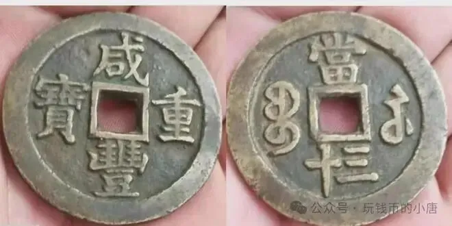 当时币值规定当五十及以下计值称为“咸丰重宝”,高于当五十计值称为“咸丰元宝 ”,以区别于小平钱“ 咸丰通宝”。