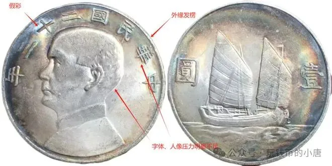 真银元是采用压力适度的冲压机械,而假银元钢模制作质量较差,多为手工压铸,所有真品色泽自然细腻、光亮,文字、图案清晰,深浅适度,伪品则不然。真品边道线条粗细均匀,间距稀密一致,同时内外珠圆大小一致,间距相等,伪品则相反,齿与齿之间的距离不完全相等。