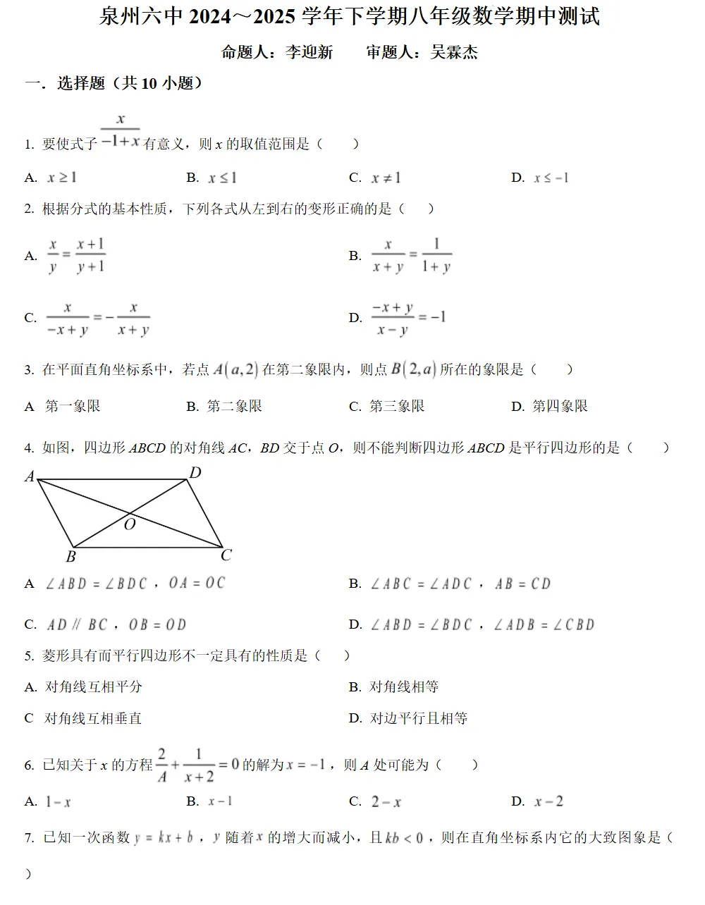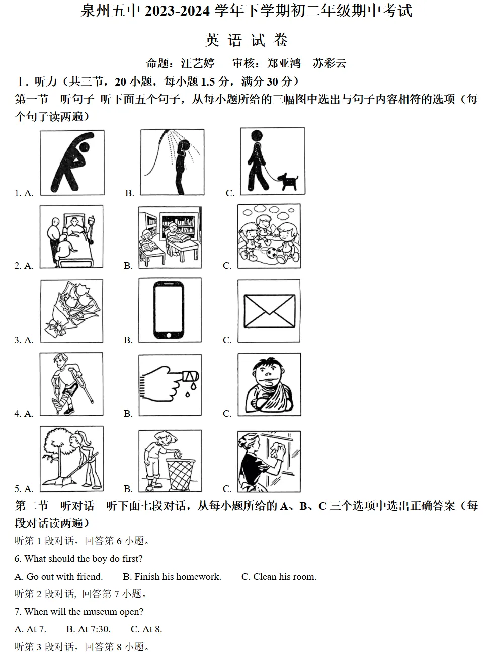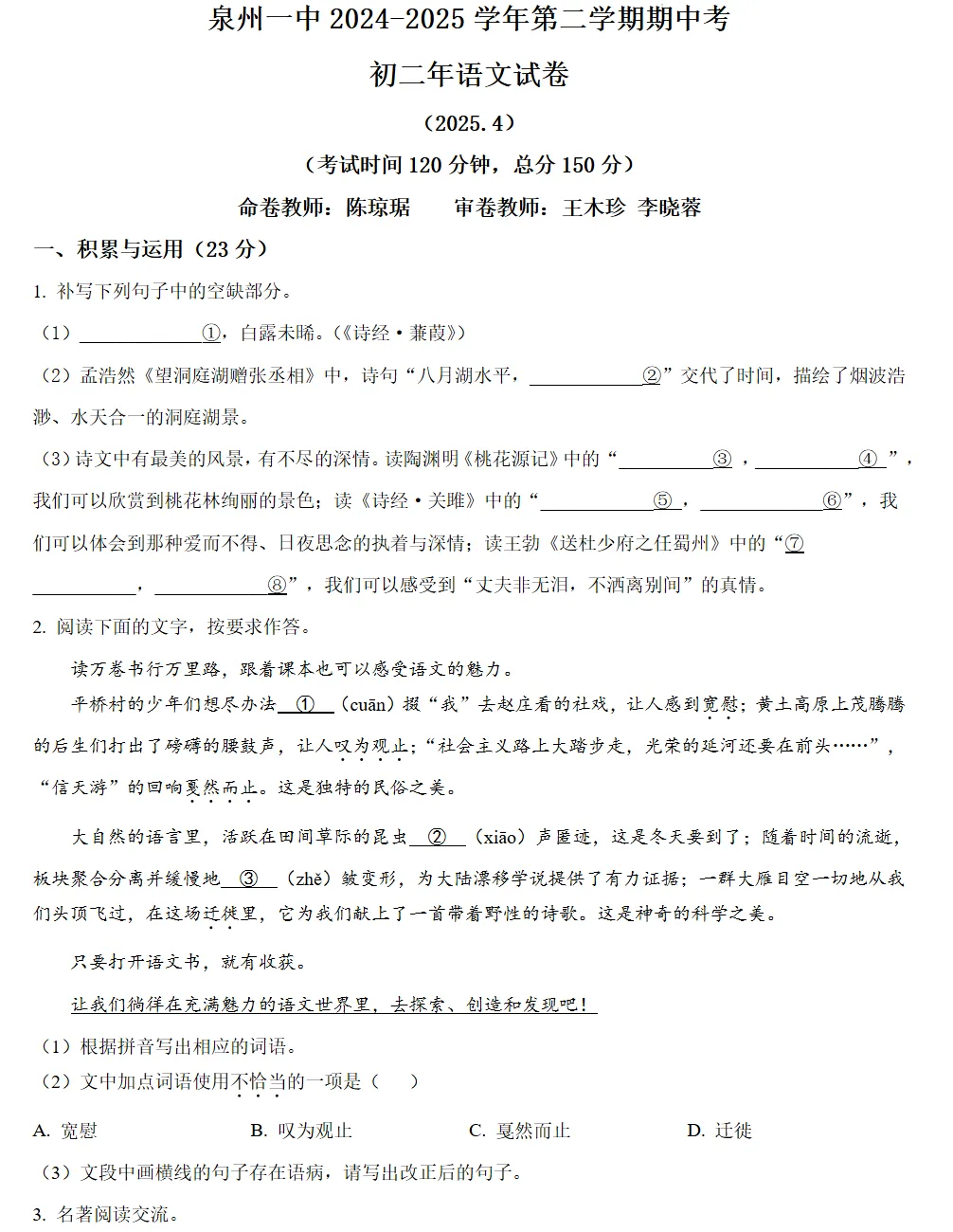 #晋江一中初一下学期期中考试卷#养正中学初一下学期期中考试卷#晋江陈埭江滨初一七校期中考真题答案#磁灶片区初一期中考试卷