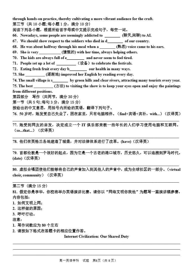 0.5 | 运用所给的部分英语翻译;句子结构不完整;有很多语法错误,严重影响意思表达。 若没有用所给的英语翻译,属于没有按要求做题,即使翻译正确,只能得该档次分数。 |