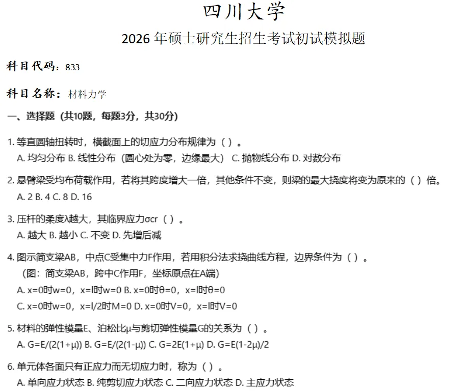 >四川大学833材料力学考研真题模拟