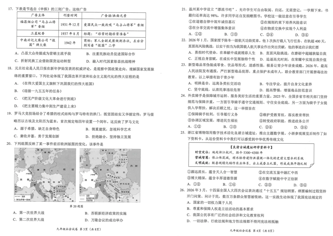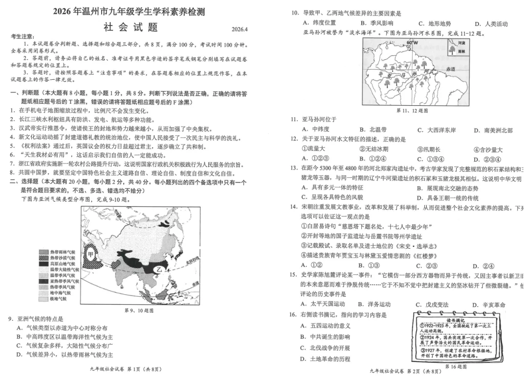 >【社会一模】2026年温州社会一模试卷(含答案)