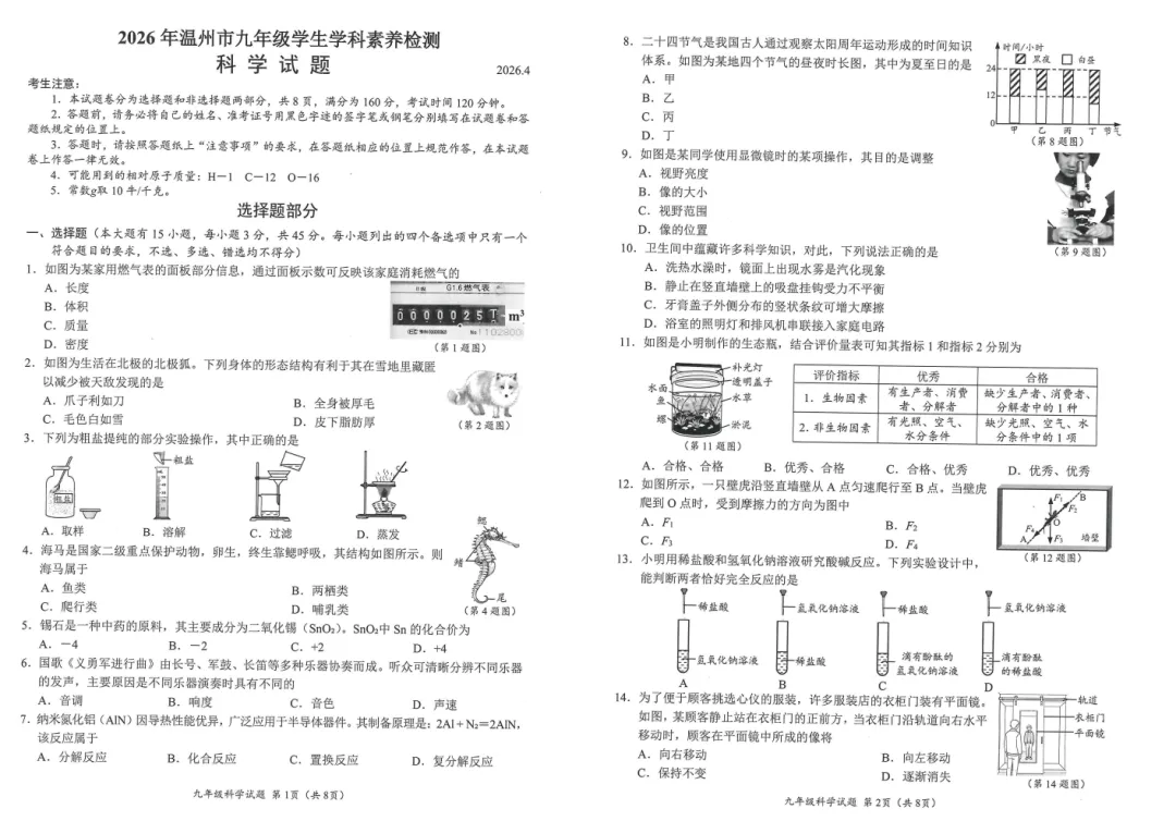 【科学一模】2026年温州科学一模试卷(含答案)